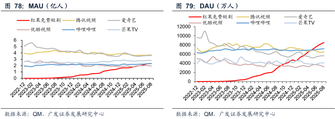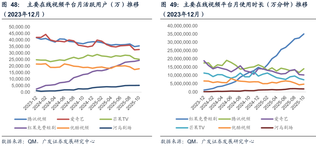 流量端:我们认为长视频过去用户和时长的下滑,和内容供给的关系更强,短剧主要形成了替代的选择,但也一定程度是通过新的内容品类做出了增量市场,我们始终认为短剧的商业模式是流量变现,而非完全是长剧的内容变现。25年1-10月的平均月活来看,腾讯视频/爱奇艺/芒果TV和优酷同比变化分别为-7%/-9%/ 9%/-6%,月均市场的同比变动分别为-15%/-14%/-7%/-13%。短剧app,以红果和河马剧场为例,2025年1-10月平均月活同增156%/198%,时长同比增长为342%/543%。