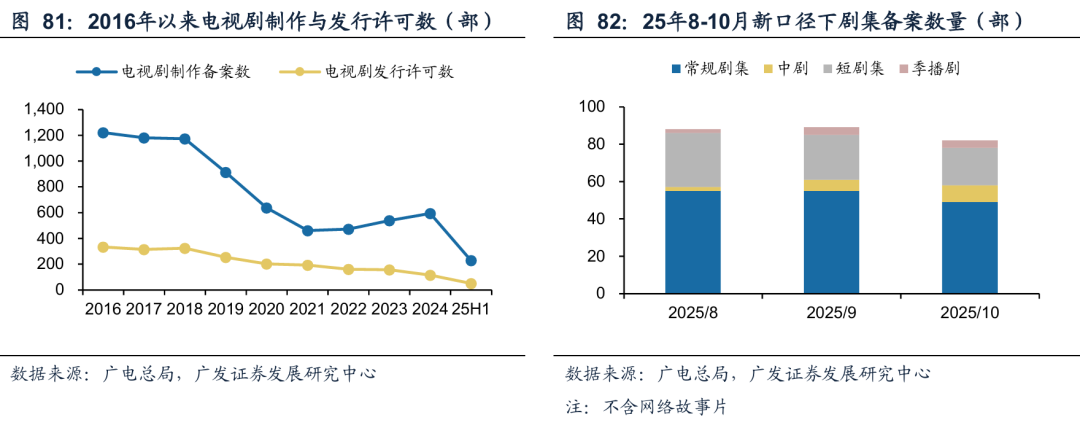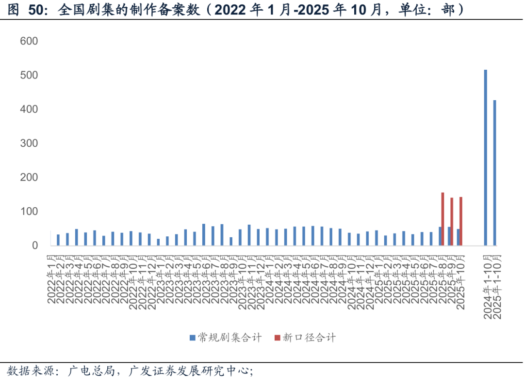从25年8月开始,电视剧和网络剧制作备案按照全新的品类定义与划分,综合分成传统电视剧、中剧(每集20分钟左右,类似于《我爱我家》)、短剧集(20集以内,类似于《我的阿勒泰》)、季播剧(类似于奈飞的《纸牌屋》)、网络故事片(单集60分钟以上,不超过上中下三集),对新形式的剧集有望加大扶持力度,实施边审边播。新口径下,中剧的备案通过数量有明显的增长,新的内容形式得到了更多的鼓励。从11月中到12月初,广电总局召开多个座谈会,对精品中剧、网络故事片、短剧集这类小体量、短时长的剧集进行重点扶持,推动平台流量倾斜和新的审核形式试点,有望带动资金流转速度加快,激活市场活力。