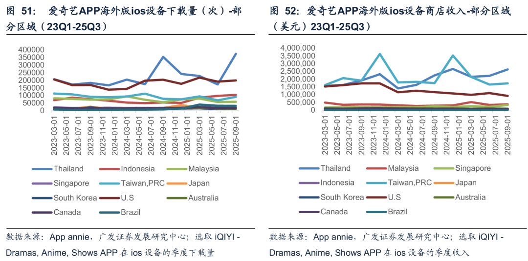 中长期来看,中国剧集在海外市场的拓展也有较高的天花板,以爱奇艺为例,今年以来海外区域收入增势良好,根据appannie的应用下载量和收入跟踪来看,爱奇艺海外版在东南亚、北美都有较好的发展趋势。而海外业务主要依托国内自制内容进行翻译,结合少部分东南亚本土化的内容投入,边际成本较为可控。芒果超媒也逐步将优质的综艺内容同步东南亚等地的电视台渠道进行播出,芒果TV海外版也在稳步推进。