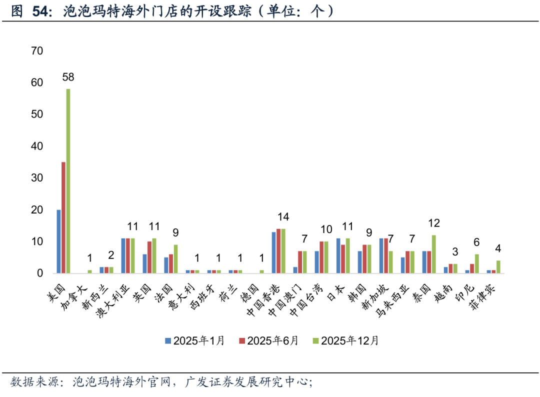年初至今海外开店超过70间。我们根据泡泡玛特海外官网的门店数(可能和实际情况有滞后性),截至2025年12月8日,海外门店(含中国港澳台地区)一共有186间,较6月增加了38间,较1月增加了72间。其中门店数最多的在美国地区,达到了58间。
