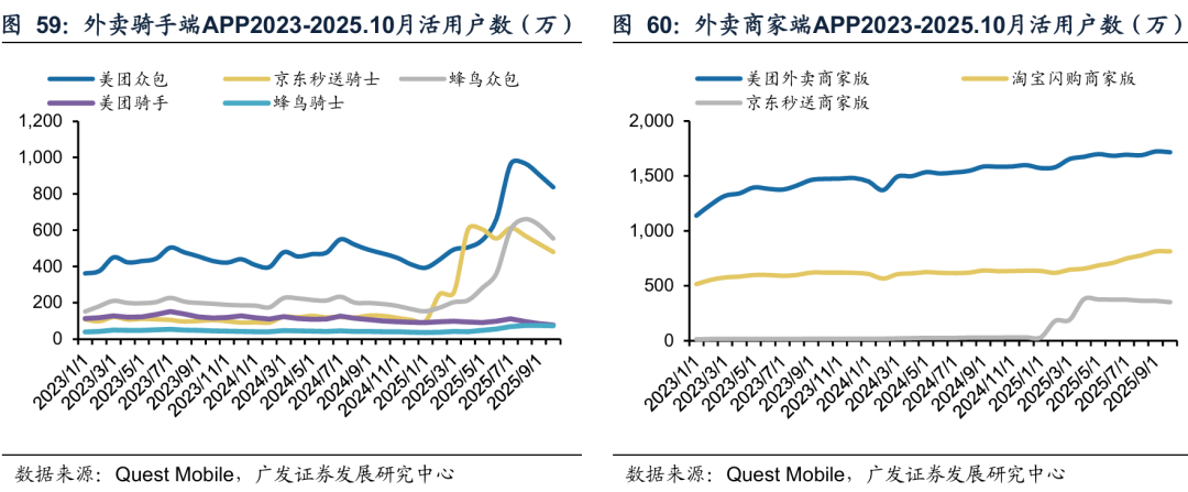 供给侧来看,美团、淘宝闪购以及京东秒送商家入驻均快速拓展。2025年10月美团外卖商家版和淘宝闪购商家版的MAU增速分别达8.41%和28.23%。其中,淘宝闪购(原饿了么)活跃商家数从6月至10月分别同增14.4%、21.7%、25.2%、26.9%和28.2%。京东秒送2025年2月商家版活跃用户数为179.84万,至2025年10月增长至350.72万。