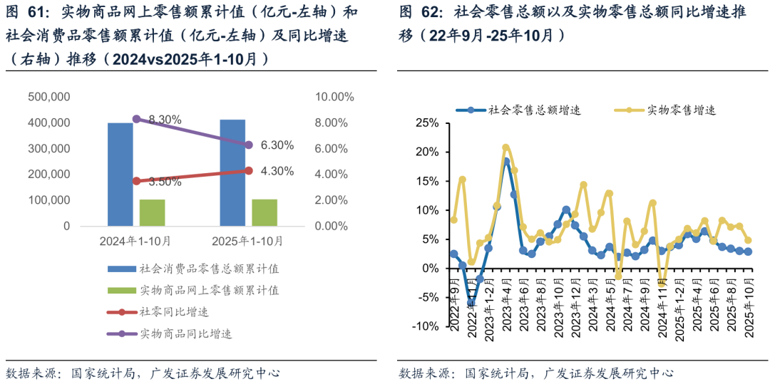 社零大盘增长缓慢。2025年1-10月社会消费品零售总额累计值达到41.2万亿元人民币,同比增长4.3%;2025年1-10月实物商品网上零售额累计值达10.4万亿元人民币,同比增长6.3%,线上渗透率达到25.2%,较去年同期25.9%有0.7pct小幅下滑。社零大盘增长缓慢制约了电商板块整体增速,线上实物零售渗透率小幅下降,但整体依然处于25%水平以上。