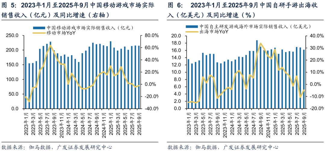 2025年游戏板块同比高增长,景气度改善明显。根据游戏工委数据统计,2025年前9个月,中国游戏市场实际销售收入为2560.26亿元,YoY 7.1%。游戏市场总规模持续扩张。移动游戏同比持续增长,前九个月合计1897亿元,同比增长9.5%。移动游戏以外的游戏市场销售收入663.26亿元,同比增长0.7%。我们预计主要受到PC端场景复苏的影响。出海方面,前九个月国内自研游戏出海收入同比144.95亿美元,同比增长5.6%。