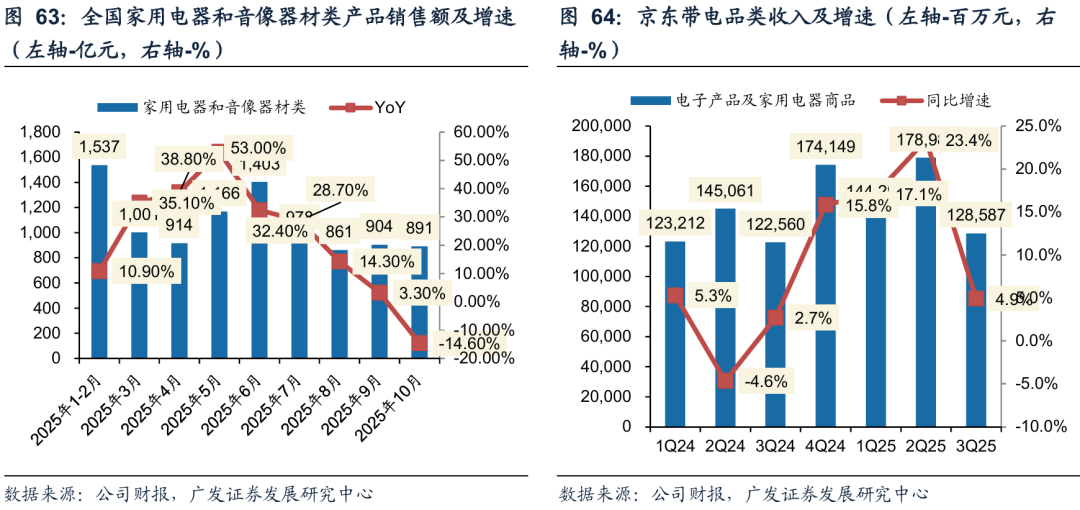 2025年主流电商平台受益于家电以旧换新补贴。按照国家相关通知,冰箱、洗衣机、电视、空调等12类家电产品,购买达到相应能效标准的新机,可按最终销售价格享受15%-20%的补贴,每件最高不超过2000元。根据2024年披露的数据,以旧换新已带动8大类家电实现销售量6200多万台、直接拉动消费近2700亿元,并带动相关产品销售总额超过1.3万亿元。京东、淘宝、抖音等平台集中上线“国补”专区、承担线上补贴申领与核销的功能,电商平台在家电品类的成交额和用户规模实现了明显提升。京东的带电品类在2024年4季度至2025年2季度分别实现了 15.8%、 17.1%、 23.4%的同比增速。