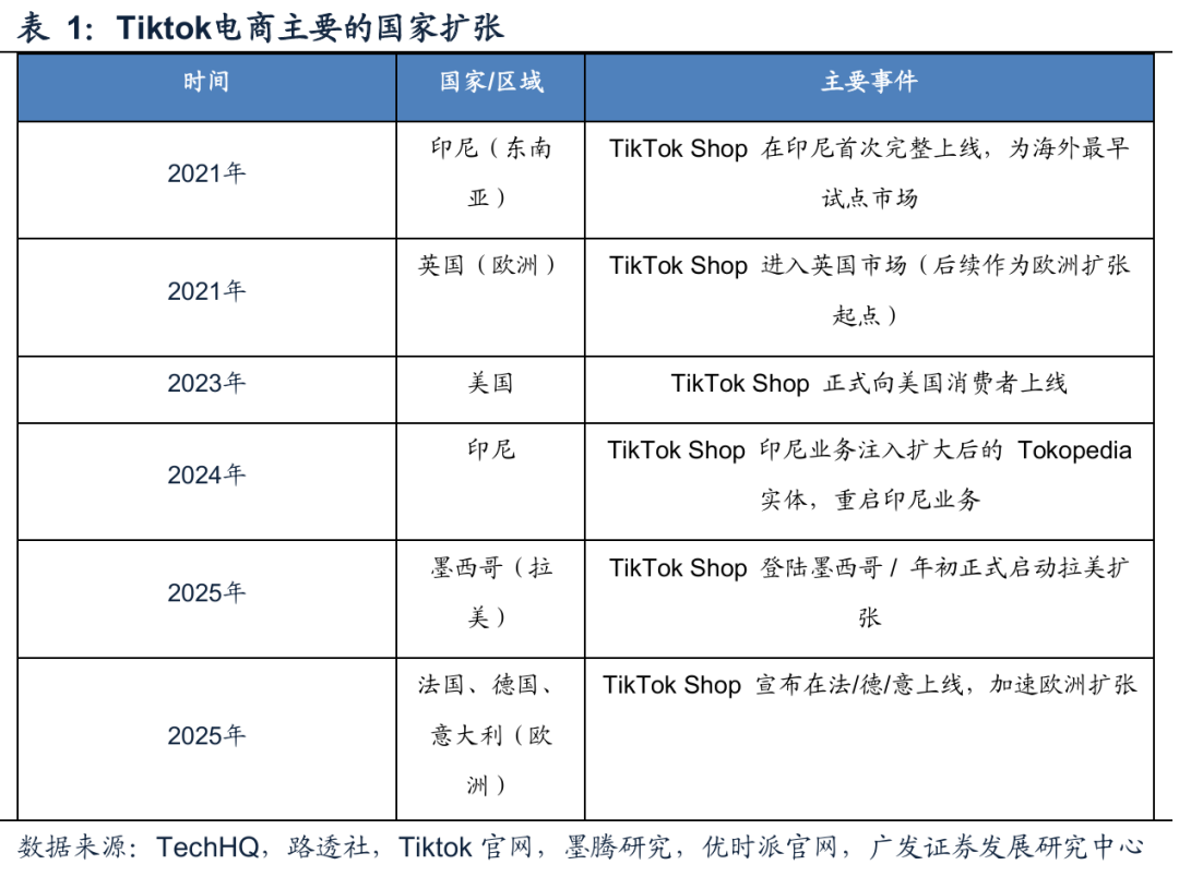 Tiktok电商开始于2021年,在过去几年完成了从跨境电商到依赖本地供给和本地物流履约的模式转变。在区域拓展方面,开始于东南亚的印尼(2021年),目前主要在东南亚、北美、欧洲以及拉美展业。
