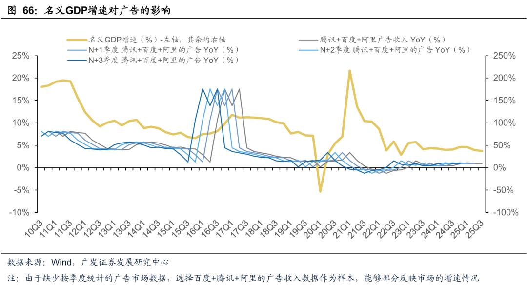 营销大盘及宏观经济影响:我国广告经营额走势与宏观经济、消费水平相关性强。以百度 腾讯 阿里的广告收入数据作为样本,部分反映广告营销市场的增速情况。25年以来,我国名义GDP整体稳定增长,头部互联网公司的广告收入同比增速稳在10%左右。根据广发宏观组报告《经济温差缩小,资产叙事收敛:2026年宏观环境展望》,从近月数据看,国补之外的零售实际上已经在改善趋势中,国补商品受动能减弱和基数双约束。2026年社零可能会继续受国补类耐用品高基数约束,不一定会明显高于今年;但服务类消费去年增速高,今年增速中等,在“十五五”规划提升“消费率”、带薪错峰休假等政策方向下,明年有提高空间,从而GDP口径的消费(居民人均消费支出)增速高于今年。展望2026年,我们认为随宏观环境和消费景气度的回升,营销大盘有望持续稳健修复,头部公司的复苏弹性或更强。