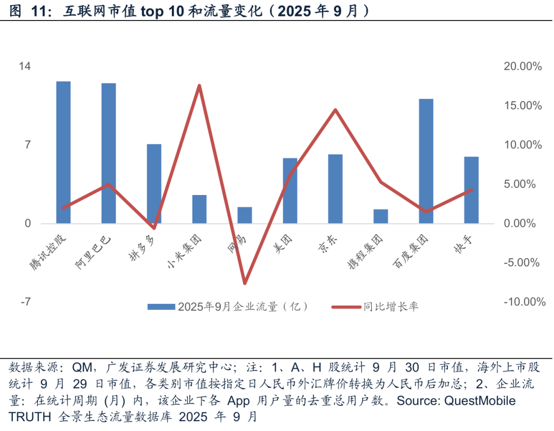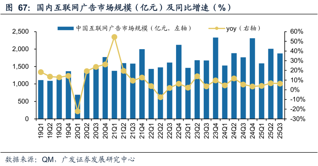 (1)根据QuestMobile,2025Q3互联网广告市场规模为1875.1亿元,同比增长约6.4%,连续多年快于广告市场大盘,说明随着广告主愈发看重广告投放的转化效率,广告预算仍在持续向线上转移。