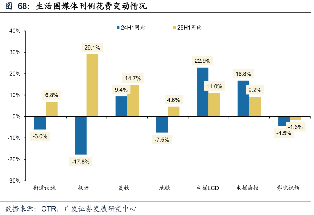 线下平台看,户外广告中梯媒份额扩张,即时零售增加线下广告投放。根据CTR,分广告渠道看,线下广告中,梯媒的韧性与增长空间凸显。品牌广告从投放到产生转化效果的链条更长,广告主预算流向流量相对恒定的媒体。影院媒体受内容供给和票房影响波动,街道设施、机场等受出行活动活跃度影响,梯媒是相对更具增长空间和韧性的品牌广告类型,有望持续吃到份额。根据CTR,25H1,电梯LCD、电梯海报广告刊例花费分别同比增长11.0%、9.2%,增速与24H1相比整体略有放缓但仍在较好增长状态。