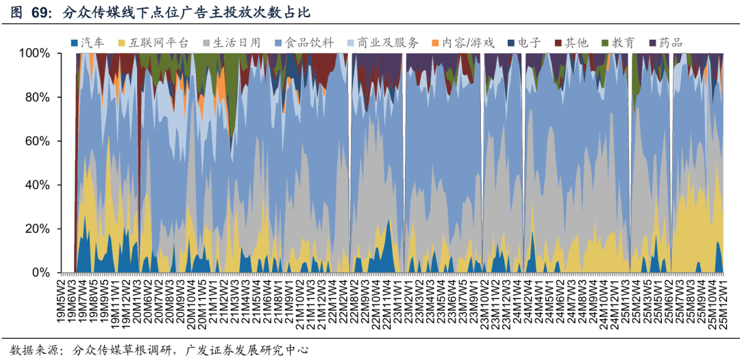 从趋势看,广告主对梯媒等用户流量、时长稳定的渠道的投放意愿和预算仍在提升。从大厂新业务产生的投放需求来看,即时零售竞争加剧,加大户外广告投放力度。外卖大战自淘宝闪购4月30日升级上线,大厂在闪购等即时零售业务的竞争加剧,广告投放力度加大。根据我们对分众的线下草根调研,Q3互联网平台的投放次数占比提升。