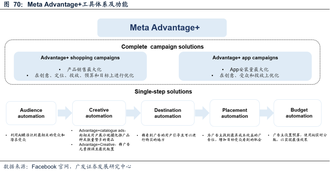 大媒体方面:海外龙头公司广告收入保持景气增长,他们已将AI应用于自身广告业务,并面向广告主发布AI营销工具,提升广告投放效率。以Meta为例,Meta2022年以来推出Advantage 投放工具,借助AI赋能精准识别受众、自动完善素材、引导用户购买、实时分配预算等环节,能够使广告主实现营销活动的自动化或半自动化。