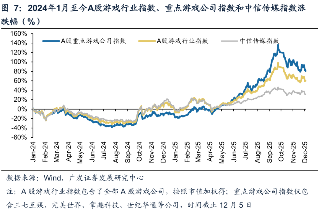 纵观整体市场表现,2024年1月1日至2025年12月5日,A股游戏行业指数累计上涨60.04%,中信传媒指数上涨31.73%,A股重点游戏指数累计上涨80.82%。我们认为,游戏行业总体景气度在2025年有所改善,带动行业股价有所体现。一方面,游戏市场规模增长,A股游戏新品增加;另一方面,头部公司新品表现突出是主要驱动。同时游戏行业政策端及竞合格局有所改善,板块整体估值中枢有所提升。