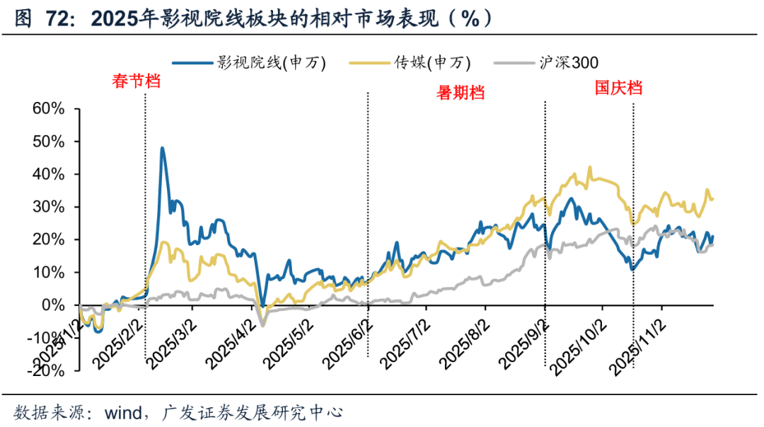 复盘A股影视院线板块在2025年的股价表现。截至2025年11月28日,SW影视院线指数较2025年初上涨了21.01%,跑输SW传媒指数11.46个百分点,跑赢沪深300指数2.52个百分点。今年影视板块整体波动较大:(1)2025年春节档后,因《哪吒之魔童闹海》现象级的票房表现,带动国内票房大盘及影视院线板块股价强势上涨;其后3月到5月,因缺乏头部影片上映(春节档后没有新片票房超过5亿元),国内观影需求持续低迷,影视院线板块随之走低。(2)6月中上旬,暑期档迎来定档高峰期,驱动影视院线板块回暖;但暑期档整体表现较为平淡,票房和去年基本持平,且档期内没有一部超过30亿的影片,部分大制作折戟,因此后半程震荡调整。(3)暑期档后档期效应继续减弱。9月《731》票房超预期,带动当月票房在冷档期的情况下同比提升82.86%。但国庆档表现不佳,仅录得票房18.35亿元,不仅在去年低基数上再次下探,且整体上回到了2015-2016年的国庆档大盘水平。11月中旬,几部热门进口片陆续上映,叠加短剧、漫剧行业景气度趋势凸显,带动影视板块整体抬升。