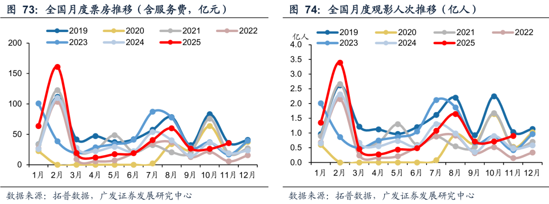 影院竞争加剧。根据拓普数据,2025年11月全国在运营影院共计12533家,环比减少157家,同比增加550家;全国在运营影厅共计74722个,单影厅产出(TTM)为59.89万元/厅,环比增长3.20%,同比增长9%,比2019年同期减少39%。