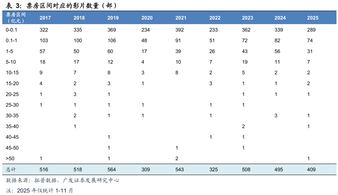 票房大盘同比改善,但分化明显。根据拓普数据,2025年1-11月全国累计票房(含服务费)481.15亿元,同比增长19.87%;2025年1-11月全国累计观影人次为11.47亿人次,同比增长20.60%。今年电影市场分化明显,首先体现在淡旺季分异上,淡季优质影片供给匮乏,票房与观影人次持续下探,2025年1-11月中,共有19周观影人次小于1000万人/周,而24年同期仅有11周、23年同期仅有8周小于1000万人/周;2025年1-11月,有41天日票房(含服务费)低于2000万,2024年同期为5天、2023年为4天。今年热门档期影片扎堆上映,单日票房突破4亿元的天数刷新历史记录,但重点档期的加持效应实际上有所减弱。暑期档《酱园弄·悬案》、《东极岛》两部大制作影片折戟;国庆档档期内没有一部影片超过5亿。而较冷档期上映的《731》、《疯狂动物城2》则有亮眼的票房表现。