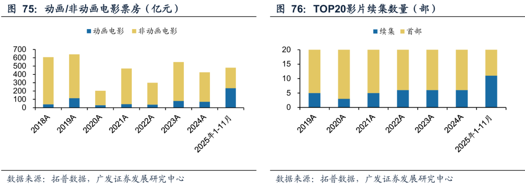 观影选择以信任度为导向。今年动画电影占据了近半数的票房大盘,而从2018年到2024年,动画电影票房在大盘中占比从未超过20%。真人电影在以往积累的信任危机集中爆发。另一方面,今年TOP20的影片中,续集的占比显著提升,观影选择趋向确定性。由于票价提升,看电影作为非必须的娱乐活动,映后口碑成为观影选择的重要参考。