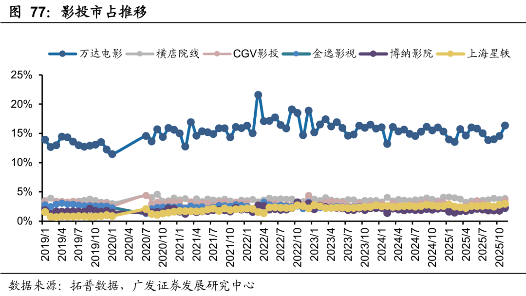 2025年11月,国内影投公司的票房市占率Top3分别为万达电影(市占率16.37%)、横店院线(市占率3.87%)、CGV影投(市占率3.55%)。影投集中度下降,从1-11月累计票房看,CR3减少0.42pct至20.84%,CR5同比减少0.76至25.21%,CR10同比减少1.67pct至32.04%。年轻观众在今年持续流失,1-9月2025年30岁以下的购票人群占比仅有38%,影院的社交属性降低。部分影院开始在线下影院渠道中融入IP运营与谷子经济等新业态,丰富消费场景。
