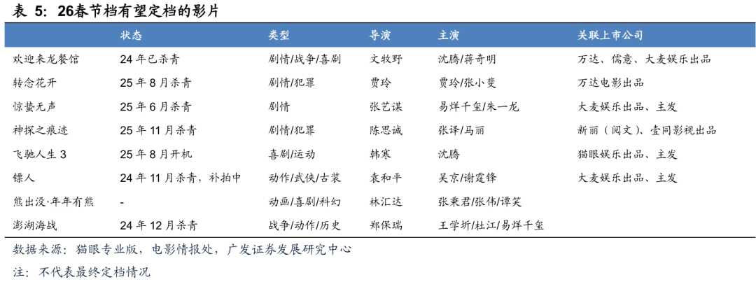 关注贺岁档热门进口片票房表现以及春节档定档情况。11-12月,随着热门进口片的陆续上映,电影票房大盘整体提振。根据猫眼12/13预测,《疯狂动物城2》有望实现票房超38亿元,预期较上映伊始大幅上调。此外《阿凡达3》已定档12/19,两部前作在国内皆实现票房17 亿元。综合看,截至2025/12/14,全年票房已超500亿元。从供给侧来看,由于26年春节相对较晚,当前节点影片定档信息尚未释出,从各家在手片单看,有望定档的有《惊蛰无声》《转念花开》《欢迎来龙餐馆》《熊出没·年年有熊》等。但26年春节假期(2/15-2/23)相较以往天数有所增加,若后续供给充分,将有望续写高景气度,建议左侧布局。