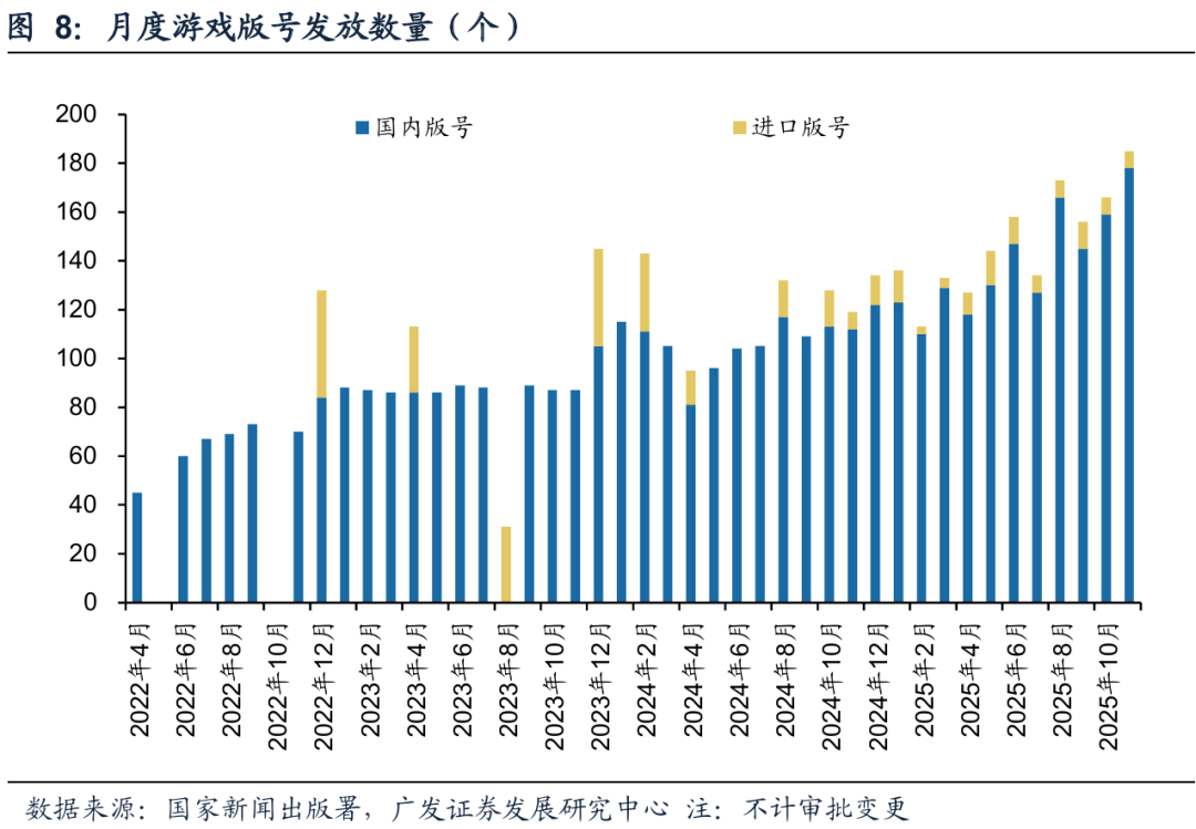 版号发放稳定,月度发放数量提升。2024年以来,国内游戏版号发放数量有所提升,该趋势在2025年得到了延续。根据国家新闻出版署,2025年11月,国产游戏版号月度发放数量达到178款,发放数量进一步提升。进口版号发放频次增加,每月稳定发放。我们认为,版号总体发放节奏稳定、发放数量持续提升,有利于提振行业信心。