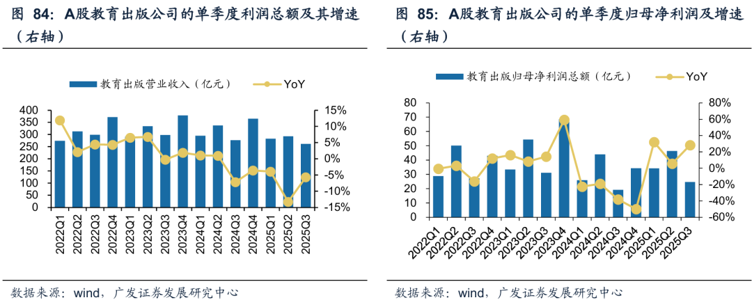 复盘A股出版板块在2025年的业绩表现。(1)由于出版类国企享受的免征所得税政策延续至2027年底,教育出版公司25前三季度净利润总体增长。部分省市因教辅征订发行方式改变、少数取消或推迟了评议类教辅发放,导致收入利润出现明显下滑。25Q1-Q3,A股17家教育出版公司的总营收为836.96亿元,同比减少7.92%;利润总额为110.90亿元,同比减少8.17%;归母净利润105.11亿元,同比增长18.11%。25Q3,教育出版公司的总营收为261.25亿元,同比减少5.68%;利润总额为26.85亿元,同比增长1.58%;归母净利润24.59亿元,同比增长28.23%。