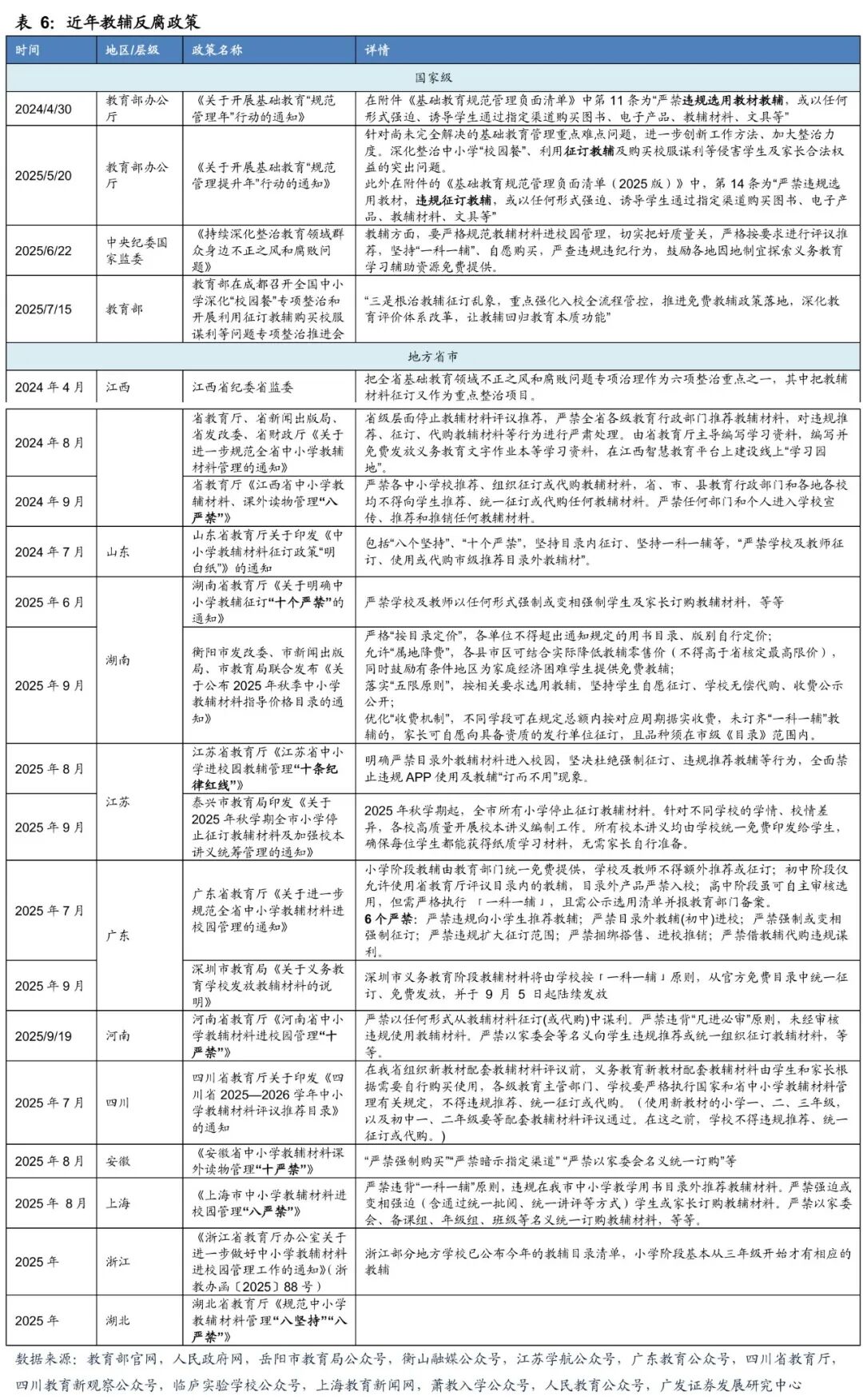 25年5月,教育部下发《关于开展基础教育“规范管理提升年”行动的通知》,相较于24年的“规范管理年”,其负面清单细则中将“违规选用教材教辅”改为了更具针对性的“违规选用教材,违规征订教辅”。因此在教育部“规范管理提升年”的统筹下,湖南、江苏、广东等多省教育局陆续跟进,在25秋季学期开学前后出台了类似的“x严禁”通知政策,对教辅征订进行了进一步的规范。部分市级单位(如泰兴市教育局)继续加码,宣布“全市所有小学停止征订教辅材料”。