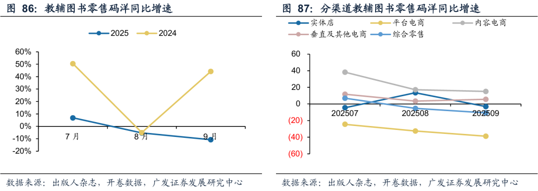 虽然教辅征订受到了严格限制,但是市场化教辅的零售端在今年并未有明显提升。根据出版人杂志引用的开卷数据,25年9月开学月,全国教辅图书零售同比下降10.7%,而去年同期同比增长44.3%。尤其是平台电商渠道,9月同比降幅达到了38.8%。分渠道看,7-9月平台电商教辅销售同比持续下行,其他相对平稳,只有内容电商整体增速显著高于其他渠道。