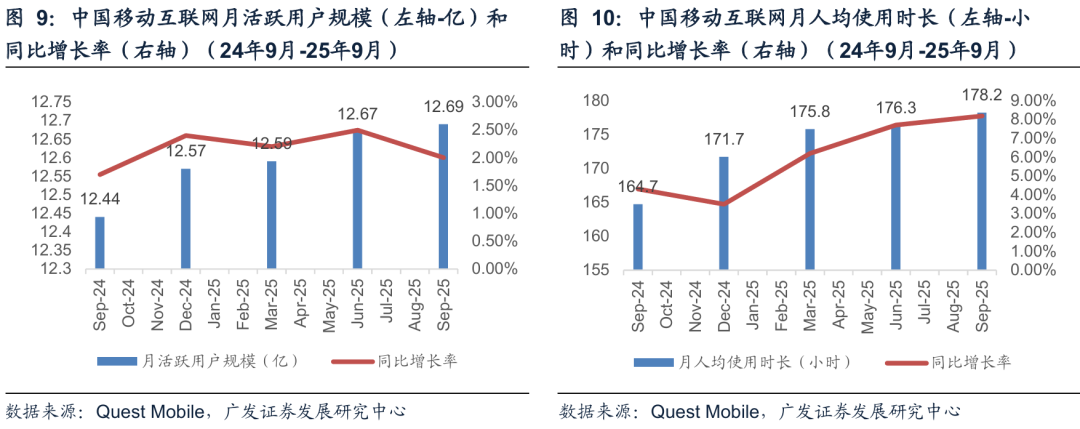 用户规模增长保持稳定,用户时长增长呈现提速趋势。根据questmobile2025年9月的报告显示,移动互联网用户规模增速已经趋于平稳,行业增长开始向深度运营和细分领域的创新和发掘,用户时长呈现了增长提速的态势。
