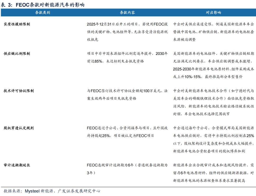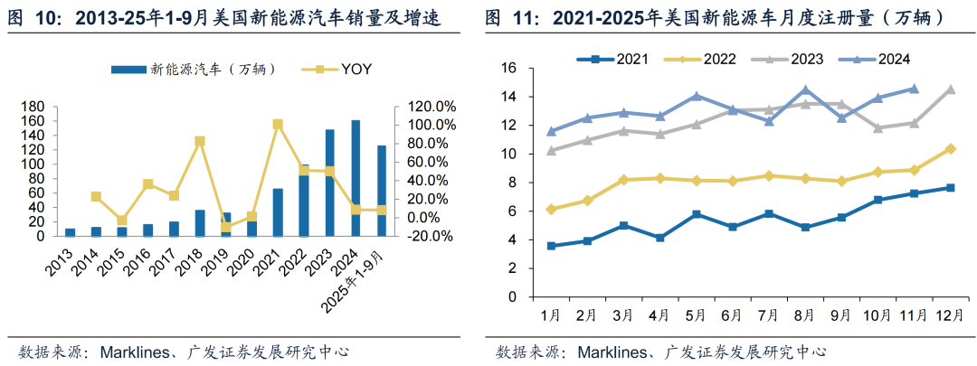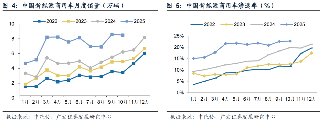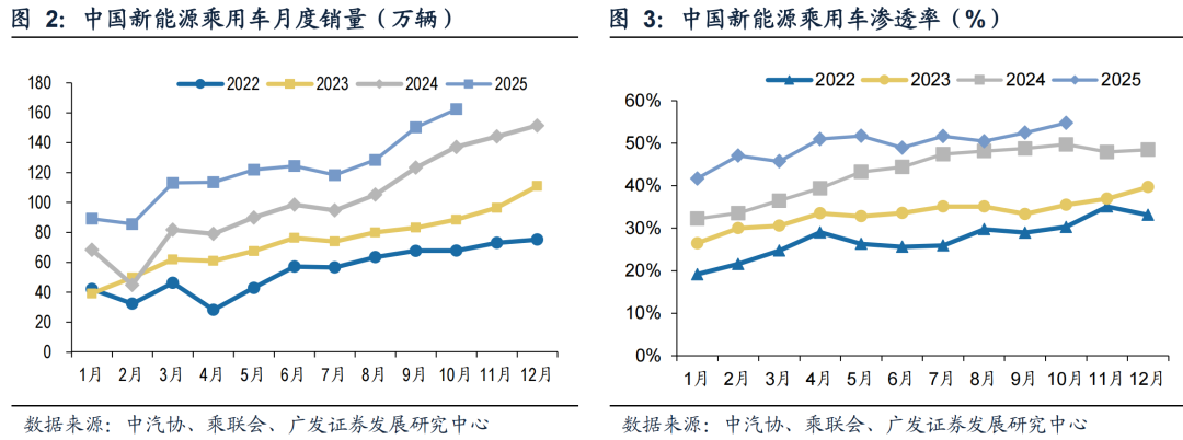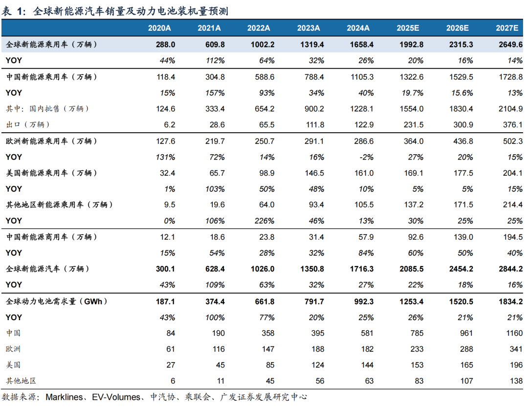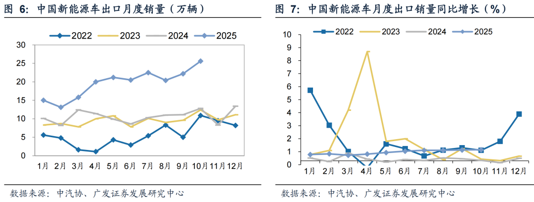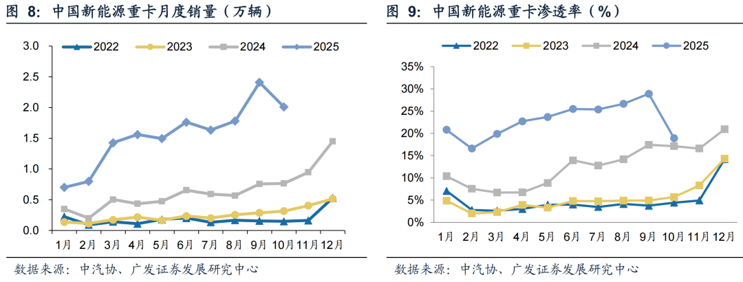 国内:25年抢装带动需求高增,预计26年新能源乘用车实现平稳增长,新能源商用车跨越经济性拐点,电动化率快速提升,高增长有望延续。2025年中国新能源汽车市场继续保持强劲增长态势。根据中汽协数据,2025年1-10月,中国市场新能源汽车销量达1294.3万辆,同比增长32.7%,电动化率达51.6%。其中,新能源乘用车国内销量达到1092.9万辆,同比增长25.7%,新能源商用车国内销量为64.9万辆,同比增长60.2%。我们预计,2025年中国市场新能源乘用车销量将达到1322.6万辆,同比 19.7%,电动化率为53.9%。其中,商用车销量将达到92.6万辆,同比 60.0%。2026年新能源乘用车销量将达到1529.5万辆,同比 15.6%,电动化率达61.7%。其中,商用车销量将达到139.0万辆,同比 50.0%。海外:欧洲碳排放法案要求 新车型周期到来驱动需求增长,美国补贴退坡阶段性压制需求,其他地区电动化空间广阔,增长有望持续。(1)欧洲:2025年1-9月,欧洲新能源乘用车销量为270.9万辆,同比 31.0%,电动化率达25.5%。我们预计,2026年欧洲新能源乘用车销量将达到436.8万辆,同比 20.0%,电动化率达31.8%。(2)美国:2025年1-9月,美国新能源乘用车销量为128.5万辆,同比 10.3%。我们预计,2026年美国新能源乘用车销量将达到177.5万辆,同比 5.0%,电动化率达10.7%。(3)其他地区:2025年1-9月,其他地区新能源乘用车销量为106.0万辆,同比 36.6%,电动化率达5.6%。我们预计,2026年其他地区新能源乘用车销量将达到171.5万辆,同比 25%,电动化率达6.3%。2025年,美国市场受益于供给侧产能爬坡,而欧洲等市场则面临政策扰动带来的压力。与此同时,东南亚、拉美等新兴国家在政策红利支持下快速成长。我们预计2025年整体海外市场有望超670.3万辆,同比 21.0%。2025年后有望受益于欧洲碳排放法规政策驱动电动车平台迭代,叠加美国私家车市场电动化渗透率提速,实现销量增速二次成长。新兴市场政策红利持续释放,推动电动化率持续提升。我们预计,2026年整体海外市场销量有望达到785.8万辆,同比 17%。全球动力电池需求预计将延续强劲增长态势,增速有望继续领先于新能源汽车销量增速。主要受到插电及增程车型电池大型化趋势和商用车高增的双重驱动。电池大型化直接推高单车带电量。例如,一辆电池容量80kWh的增程车,其电池需求是早期车型(30-40kWh)的2倍以上。此外,商用车因车身更大、续航要求更高,单车带电量远超乘用车,商用车销量高增将推动动力电池需求进一步上涨。我们预计,2025年全球动力电池需求量有望达到约1253.4Wh,同比 26%。2026年全球动力电池需求量有望达到约1520.5Wh,同比 21%。 (一)中国:25年抢装带动需求高增,预计26年乘用车平稳增长,商用车快速渗透1. 25年复盘:确定的报废补贴和置换补贴 购置税全免,抢装带动乘用车需求高增26年报废补贴与置换补贴延续存在不确定性,购置税从25年全免变为减半,政策叠加带动需求高增。年内政策优惠明确集中于三类:购置税全免、报废补贴及置换补贴。2026年购置税优惠将收窄为减半征收,而报废与置换补贴能否延续存在不确定性。明确的政策窗口期促使大量潜在购车需求在2025年内,特别是下半年集中释放,带动国内乘用车需求高增。置换补贴、报废补贴:25年汽车以旧换新政策明确,26年存在不确定性。根据2025年国家发改委、财政部等部门联合发布的政策,汽车以旧换新补贴标准明确:消费者报废旧车购买新能源乘用车可获得2万元补贴,购买燃油乘用车可获得1.5万元补贴。该政策执行期限截至2025年12月31日,2026年是否延续尚未明确。购置税:新能源汽车购置税政策退坡,从25年全免变为26年减半征收。根据财政部、税务总局、工业和信息化部联合发布的政策公告,新能源汽车车辆购置税减免政策将进行阶段性调整。购置日期在2024年1月1日至2025年12月31日期间的新能源汽车,将继续实施免征车辆购置税的政策,免税额不超过3万元;而购置日期在2026年1月1日至2027年12月31日期间的新能源汽车,将调整为减半征收车辆购置税,每辆车减税额不超过1.5万元。2025年政策驱动乘用车市场超预期增长,电动化率快速提升。根据乘联会数据,2025年1-10月新能源乘用车销量为1205.8万辆,同比 29.9%。10月单月为162.1万辆,同比 18.5%,渗透率为55.3%。其中,纯电动车型销量约749.7万辆(62.0%),同比 4.0%;插电混动车型销量约352.7万辆(29.0%),同比-2.9%;增程式销量约103.4万辆(9.0%),同比-1.1%。我们预计,2025年中国市场新能源汽车乘用车销量将达到1322.6万辆,同比 19.7%,电动化率为53.9%。2025年国内新能源商用车电动化率创新高,换电重卡需求激增。根据中汽协数据,2025年1-10月中国新能源商用车销量为72.0万辆,同比 63.3%,渗透率为20.7%。其中,10月单月销量为8.9万辆,同比 45.4%,单月渗透率为24.6%。其中,换电重卡市场增长显著。根据终端上牌数据,2025年1-10月我国新能源重卡累计销售15.8辆,同比 178%,渗透率为24.7%。其中,10月单月销量为2.0万辆,同比 143.6%,单月渗透率为28.7%。换电重卡优势凸显,迎来快速增长期。我们预计,2025年中国市场新能源商用车销量将达到92.6万辆,同比 60.0%。2025年中国新能源车出口表现强劲,插混车型增速亮眼。根据中汽协数据,2025年1-10月新能源汽车出口201.4万辆,同比 90.4%,占汽车出口总量的35.9%,首次突破200万辆。其中纯电动汽车出口129.6万辆,同比增长55.0%,插电混动汽车出口71.8万辆,同比 220.0%。插混车型增速显著高于纯电车型,成为出口新增长点。插混车型在