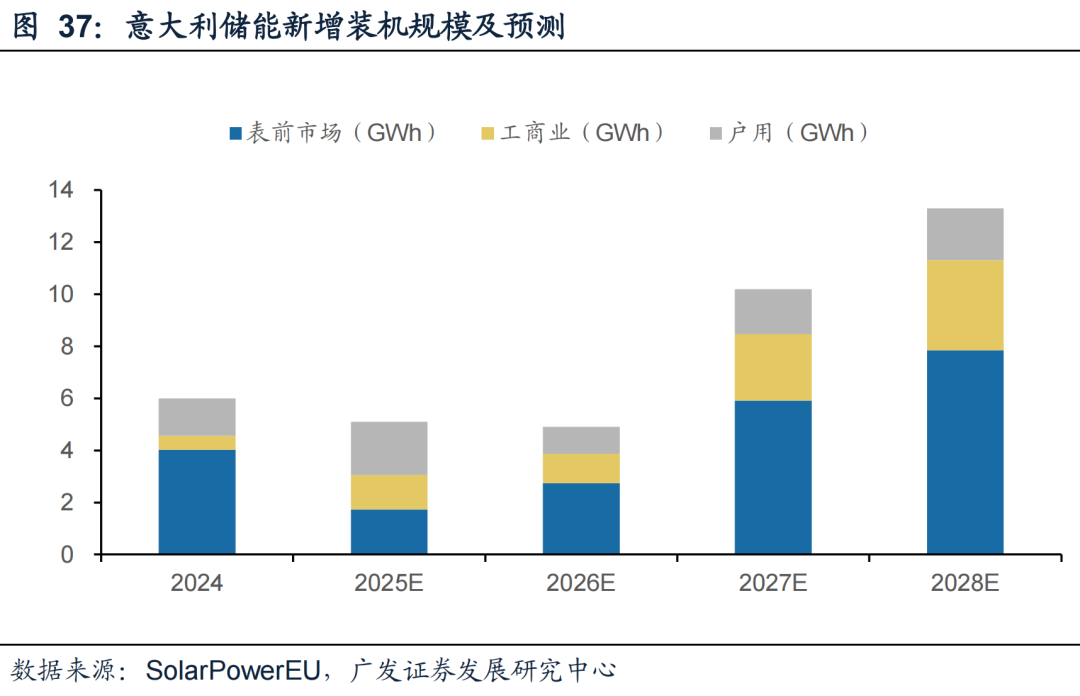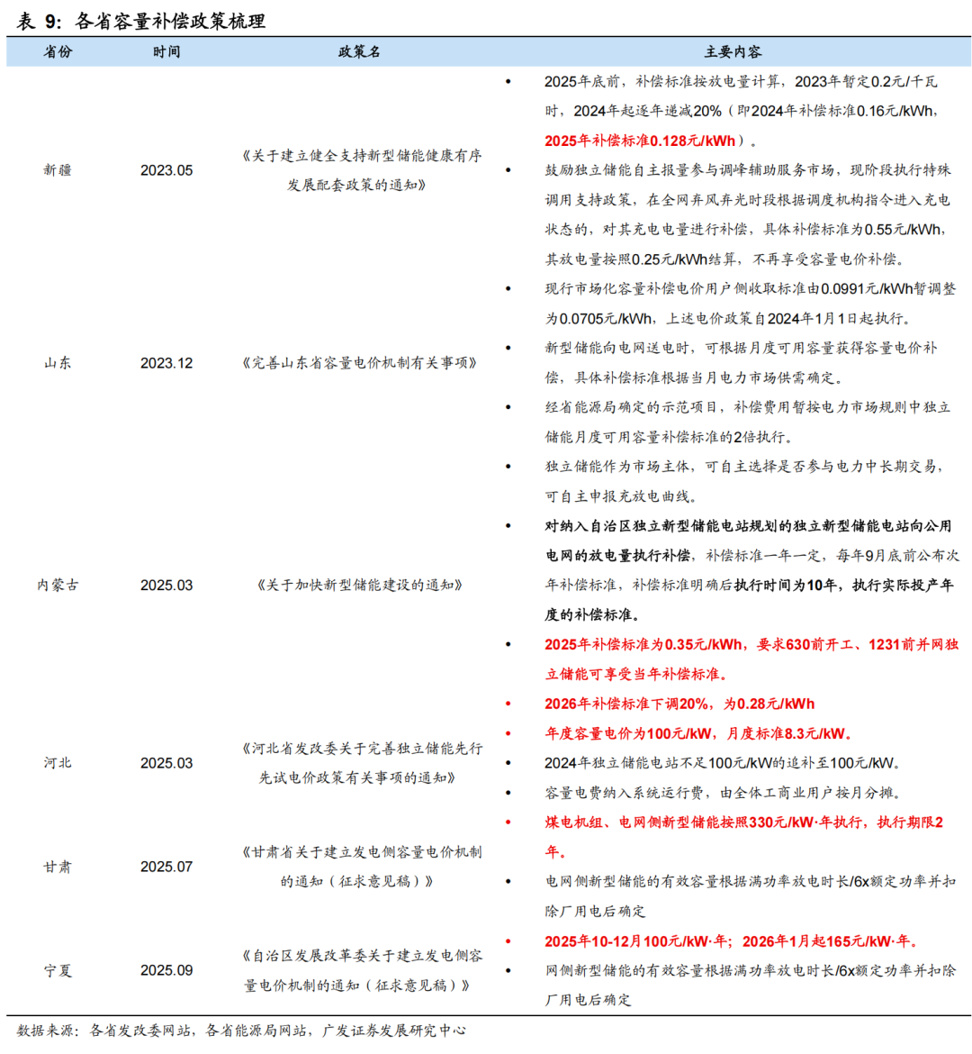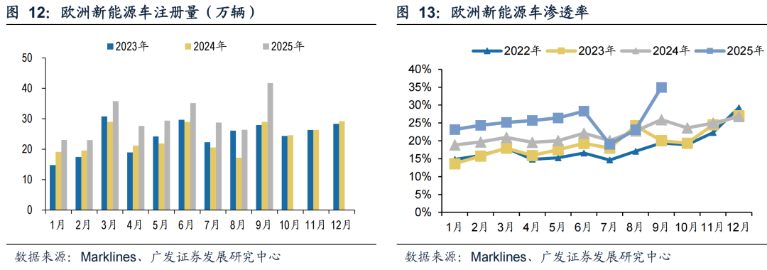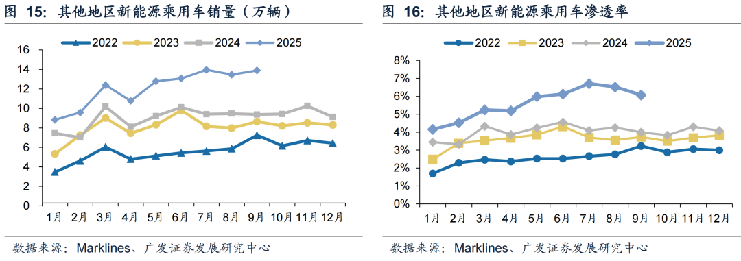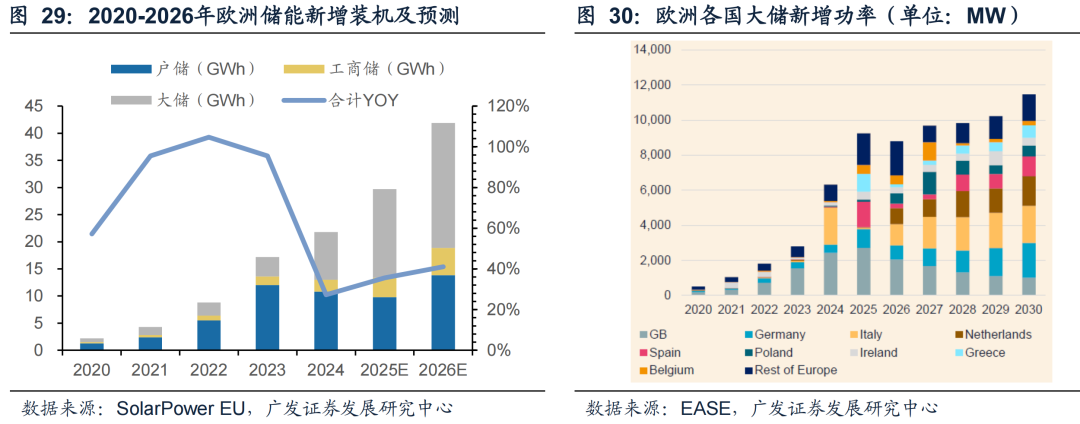 (三)欧洲:25年电动化率加速提升,预计26年碳排放法案 新车型周期共同驱动增长1. 25年复盘:欧洲新能源汽车市场2025年销量实现强劲增长,电动化率稳步提升25年欧洲市场阶段性放缓后呈现显著的复苏态势,新能源渗透率不断提升。2025年1-9月,欧洲新能源乘用车销量为270.9万辆,同比 31.0%,电动化率达25.5%。9月单月欧洲新能源乘用车销量为41.7万辆,同比 44.0%,电动化率达35.0%。市场复苏主要得益于2024年因补贴退坡及碳排放考核空窗期造成的低基数效应,以及2025年欧盟实施更为严格的碳排放新规(要求新车碳排放量降至93.6克/公里以下),倒逼车企加速电动化转型。我们预计,2026年欧洲新能源乘用车销量将达到436.8万辆,同比 20.0%,电动化率达31.8%。2. 26年展望:26年欧洲碳排放政策与新车型周期双轮驱动,共促新能源市场增长(1)欧洲碳排放政策:欧盟实施严格碳减排考核,要求车企在2025至2027年间将平均碳排放量控制在目标值以下,2030年新车碳排放需在2021年基础上降低55% ,2035年实现零排放,否则将面临巨额罚款。为免于处罚,车企需大幅提升新能源车渗透率。欧盟车企如果无法通过自身减排措施达到规定的碳排放标准,可以通过购买碳积分来满足要求。 (2)新车型周期:欧洲新车型周期的启动正加速电动化进程。2025至2028年间预计推出约50款新能源车,其中纯电车型占比高达86%,覆盖中大型轿车和SUV市场并逐步下探至入门级领域。(四)其他地区:政策红利密集释放,助推电动化率持续提升1. 25年复盘:比亚迪出口规模大,南美及东南亚占比过半新兴市场率先起步,比亚迪在南美及东南亚市场销售占比过半。据比亚迪产销公告与投资者关系记录表,2025年比亚迪海外销量持续高速增长,前三季度累计出口突破70万辆,同比增长107%,已提前完成全年海外销量翻倍目标。按照这一增速,全年出口销量有望突破100万辆大关。根据区域零售数据拆分比亚迪出海区域结构,2025年拉美市场以8.6万辆销量稳居区域榜首,同比增长321.5%,其中巴西作为核心市场,在2024年7.6万辆高基数基础上,2025年前三季度销量超过7.7万辆,超越本田并升至巴西汽车销量排行榜第七位。泰国、印尼等市场依托本地化产能逐步实现"本土生产、本土销售"的闭环。巴西、泰国为公司主要出口国家之列,据市场数据,2025年泰国电动汽车国内销售份额持续提升,巴西电动汽车市场也保持快速增长态势。2. 26年展望:政策红利密集释放,助推全球电动化渗透持续提升(1)海外市场中外合作新范式将进入兑现期,开启全球长期增长空间。当前北美(强政策周期 中性车型周期)、欧洲(中性政策周期 强车型周期)、东南亚(强政策周期 中性车型周期)、南美(中性政策周期 弱车型周期)有望于2026年后中国增速换挡下接力助推全球电动化渗透持续提升。(2)东南亚市场:2022-2023年聚焦电动车消费培育,2024年后本土电动车产业崛起支撑长期需求。当前东南亚政策红利密集释放,电动车补贴/税收优惠推出刺激短期需求,并以泰国工厂为纽带辐射东南亚市场,有望复刻日系车企成功先例。作为东南亚汽车制造中心,泰国具备完整的汽车工业产业链,2023-2025年年间通过降低进口关税鼓励本地生产、豁免电动车辆零部件和系统进口关税等产业扶持政策,重点推进本土新能源汽车产业发展,有望成为东南亚地区最大新能源整车生产及销售市场。(3)拉美市场:公共领域电动化先行,各国强化远期电动化渗透目标。拉丁美洲包含美国以南的墨西哥、阿根廷、智利、巴西等33个国家和地区,涵盖中美洲、西印度群岛及南美洲,人口基数庞大,高峰期汽车消费体量达600万辆。综合考虑汽车消费基础及较低的千人汽车保有量,经济复苏带来购买力回升,拉美地区具备长期汽车消费潜力。把握FTA政策优势辐射北美,特斯拉催化下中系零部件落子墨西哥提升全球格局,中系整车南美布局夯实长期竞争力(如比亚迪巴西工厂),产业链强化下将助力拉美电动车供需的良性循环。二、储能:容量电价完善国内大储商业模式,经济性驱动海外储能增长国内:现货市场建设快速步入正轨 各省容量电价陆续出台,带动储能项目投资的经济性显著提升,预计25-26年国内储能需求逐步加速,储能需求进入高速增长阶段。2025年国内储能装机量逐步迈入加速阶段,据CESA储能应用分会数据,2025年前三季度国内储能装机量达到85.1GWh,同比增长24.8%,其中9月份单月装机9.17GWh,同比大增171%,储能需求释放基本和现货市场建设及容量电价落地进度匹配,随着后续全国电力现货市场建设加速和各省容量电价出台,预计25年储能装机量达到153.9GWh,同比增长40.2%,26年装机量达到254.2GWh,同比增长65.2%。海外:美国OBBB法案即将落地带来短期储能抢装需求激增,欧洲新能源电力装机增长导致的电网波动和电价起伏带动储能需求快速增加,其他地区电力需求增长也提高了储能需求。(1)美国:OBBB法案加大对中国储能输美的法规壁垒,短期内储能抢装需求明显,预计25年美国储能需求增速约30%,26年储能装机量增速达到20% 。根据Wood Mackenzie数据,2025H1美国储能新增装机21.7GWh,增长42.4%,而OBBB法案将在2026年开始大幅提升对国内储能产能输美限制,预计美国储能抢装在下半年集中释放,我们预计25年美国储能装机达到48.2GWh,同比增长29.7%,美国储能具备经济性,同时考虑AIDC贡献额外增量,需求有望实现高增,考虑关税、实体限制、补贴退坡等因素影响,我们