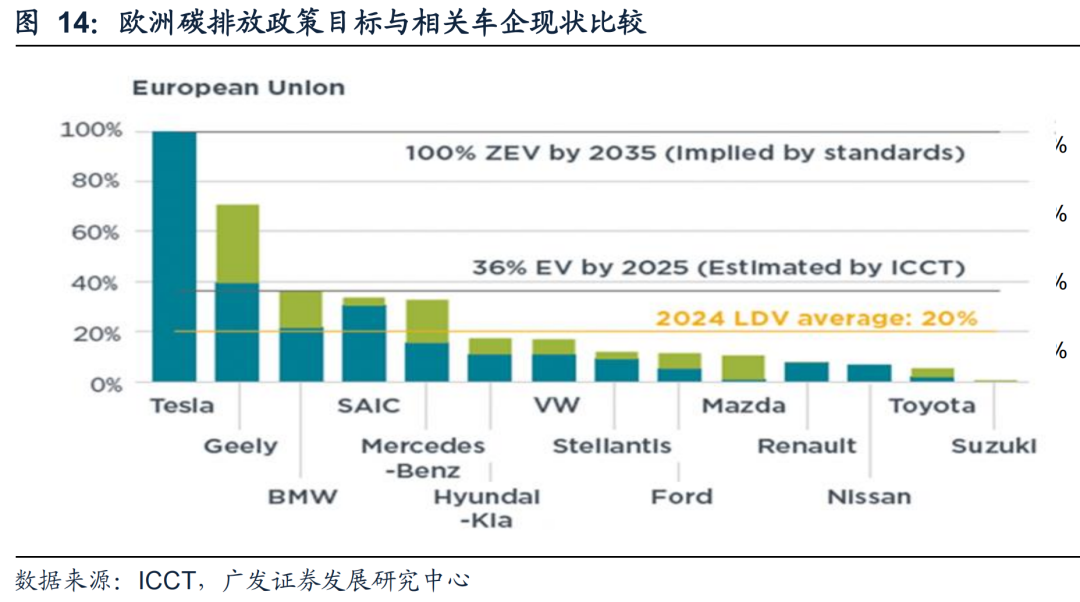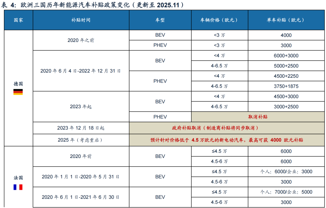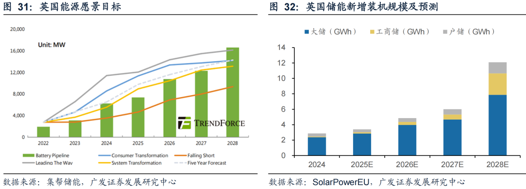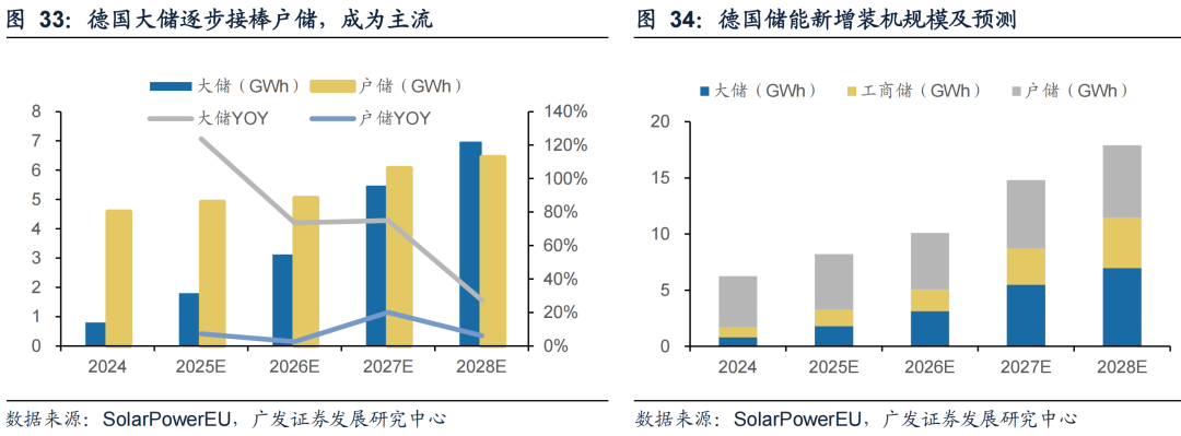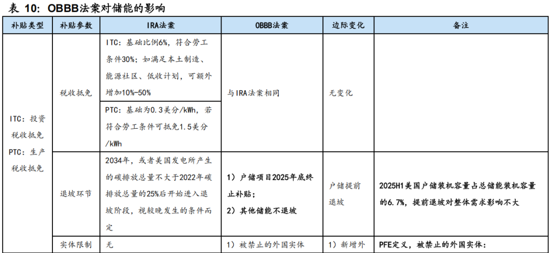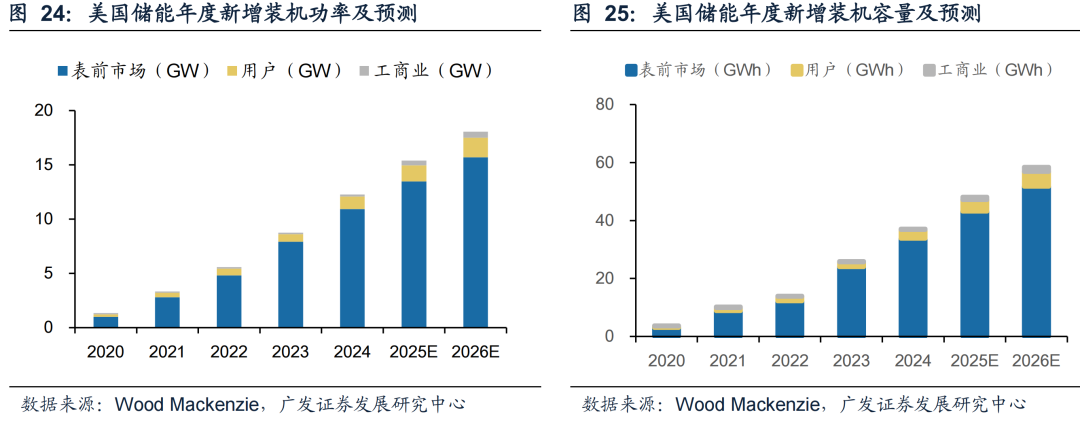 (三)欧洲:25年电动化率加速提升,预计26年碳排放法案 新车型周期共同驱动增长1. 25年复盘:欧洲新能源汽车市场2025年销量实现强劲增长,电动化率稳步提升25年欧洲市场阶段性放缓后呈现显著的复苏态势,新能源渗透率不断提升。2025年1-9月,欧洲新能源乘用车销量为270.9万辆,同比 31.0%,电动化率达25.5%。9月单月欧洲新能源乘用车销量为41.7万辆,同比 44.0%,电动化率达35.0%。市场复苏主要得益于2024年因补贴退坡及碳排放考核空窗期造成的低基数效应,以及2025年欧盟实施更为严格的碳排放新规(要求新车碳排放量降至93.6克/公里以下),倒逼车企加速电动化转型。我们预计,2026年欧洲新能源乘用车销量将达到436.8万辆,同比 20.0%,电动化率达31.8%。2. 26年展望:26年欧洲碳排放政策与新车型周期双轮驱动,共促新能源市场增长(1)欧洲碳排放政策:欧盟实施严格碳减排考核,要求车企在2025至2027年间将平均碳排放量控制在目标值以下,2030年新车碳排放需在2021年基础上降低55% ,2035年实现零排放,否则将面临巨额罚款。为免于处罚,车企需大幅提升新能源车渗透率。欧盟车企如果无法通过自身减排措施达到规定的碳排放标准,可以通过购买碳积分来满足要求。 (2)新车型周期:欧洲新车型周期的启动正加速电动化进程。2025至2028年间预计推出约50款新能源车,其中纯电车型占比高达86%,覆盖中大型轿车和SUV市场并逐步下探至入门级领域。(四)其他地区:政策红利密集释放,助推电动化率持续提升1. 25年复盘:比亚迪出口规模大,南美及东南亚占比过半新兴市场率先起步,比亚迪在南美及东南亚市场销售占比过半。据比亚迪产销公告与投资者关系记录表,2025年比亚迪海外销量持续高速增长,前三季度累计出口突破70万辆,同比增长107%,已提前完成全年海外销量翻倍目标。按照这一增速,全年出口销量有望突破100万辆大关。根据区域零售数据拆分比亚迪出海区域结构,2025年拉美市场以8.6万辆销量稳居区域榜首,同比增长321.5%,其中巴西作为核心市场,在2024年7.6万辆高基数基础上,2025年前三季度销量超过7.7万辆,超越本田并升至巴西汽车销量排行榜第七位。泰国、印尼等市场依托本地化产能逐步实现"本土生产、本土销售"的闭环。巴西、泰国为公司主要出口国家之列,据市场数据,2025年泰国电动汽车国内销售份额持续提升,巴西电动汽车市场也保持快速增长态势。2. 26年展望:政策红利密集释放,助推全球电动化渗透持续提升(1)海外市场中外合作新范式将进入兑现期,开启全球长期增长空间。当前北美(强政策周期 中性车型周期)、欧洲(中性政策周期 强车型周期)、东南亚(强政策周期 中性车型周期)、南美(中性政策周期 弱车型周期)有望于2026年后中国增速换挡下接力助推全球电动化渗透持续提升。(2)东南亚市场:2022-2023年聚焦电动车消费培育,2024年后本土电动车产业崛起支撑长期需求。当前东南亚政策红利密集释放,电动车补贴/税收优惠推出刺激短期需求,并以泰国工厂为纽带辐射东南亚市场,有望复刻日系车企成功先例。作为东南亚汽车制造中心,泰国具备完整的汽车工业产业链,2023-2025年年间通过降低进口关税鼓励本地生产、豁免电动车辆零部件和系统进口关税等产业扶持政策,重点推进本土新能源汽车产业发展,有望成为东南亚地区最大新能源整车生产及销售市场。(3)拉美市场:公共领域电动化先行,各国强化远期电动化渗透目标。拉丁美洲包含美国以南的墨西哥、阿根廷、智利、巴西等33个国家和地区,涵盖中美洲、西印度群岛及南美洲,人口基数庞大,高峰期汽车消费体量达600万辆。综合考虑汽车消费基础及较低的千人汽车保有量,经济复苏带来购买力回升,拉美地区具备长期汽车消费潜力。把握FTA政策优势辐射北美,特斯拉催化下中系零部件落子墨西哥提升全球格局,中系整车南美布局夯实长期竞争力(如比亚迪巴西工厂),产业链强化下将助力拉美电动车供需的良性循环。二、储能:容量电价完善国内大储商业模式,经济性驱动海外储能增长国内:现货市场建设快速步入正轨 各省容量电价陆续出台,带动储能项目投资的经济性显著提升,预计25-26年国内储能需求逐步加速,储能需求进入高速增长阶段。2025年国内储能装机量逐步迈入加速阶段,据CESA储能应用分会数据,2025年前三季度国内储能装机量达到85.1GWh,同比增长24.8%,其中9月份单月装机9.17GWh,同比大增171%,储能需求释放基本和现货市场建设及容量电价落地进度匹配,随着后续全国电力现货市场建设加速和各省容量电价出台,预计25年储能装机量达到153.9GWh,同比增长40.2%,26年装机量达到254.2GWh,同比增长65.2%。海外:美国OBBB法案即将落地带来短期储能抢装需求激增,欧洲新能源电力装机增长导致的电网波动和电价起伏带动储能需求快速增加,其他地区电力需求增长也提高了储能需求。(1)美国:OBBB法案加大对中国储能输美的法规壁垒,短期内储能抢装需求明显,预计25年美国储能需求增速约30%,26年储能装机量增速达到20% 。根据Wood Mackenzie数据,2025H1美国储能新增装机21.7GWh,增长42.4%,而OBBB法案将在2026年开始大幅提升对国内储能产能输美限制,预计美国储能抢装在下半年集中释放,我们预计25年美国储能装机达到48.2GWh,同比增长29.7%,美国储能具备经济性,同时考虑AIDC贡献额外增量,需求有望实现高增,考虑关税、实体限制、补贴退坡等因素影响,我们
