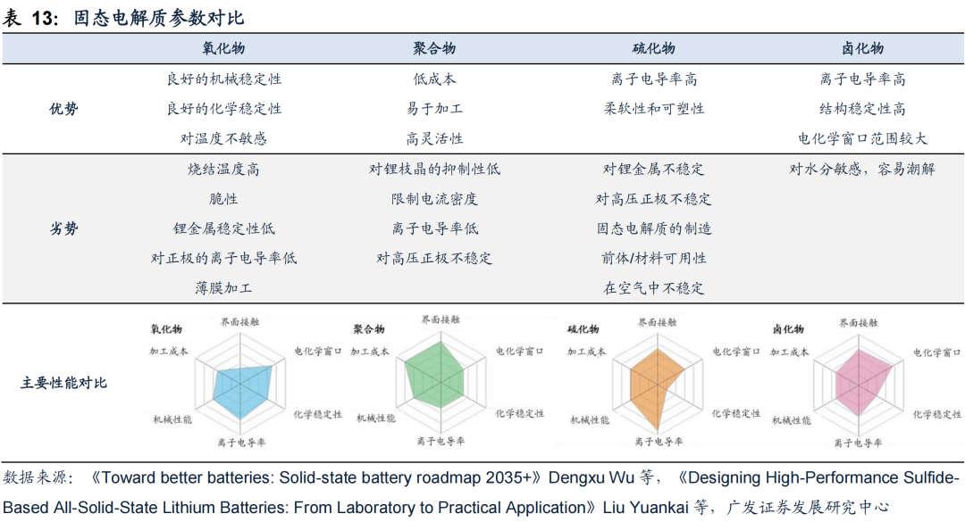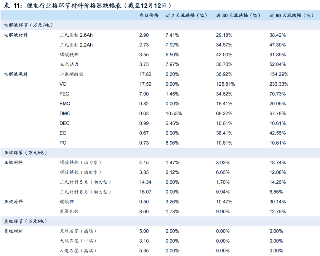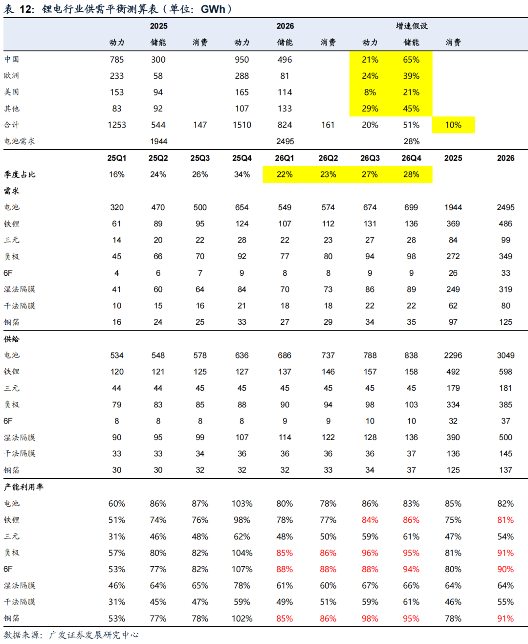动力:国内乘用车平稳增长 商用车快速渗透,海外新车型周期带动需求超预期。分区域来看:(1)中国:25年抢装带动需求高增,预计26年乘用车平稳增长,商用车快速渗透,单车带电量提升贡献额外增长。(2)美国:25年大而美法案与FEOC条款调整压制市场需求,预计26年增长趋缓。(3)欧洲:25年电动化率加速提升,26年碳排放法案 新车型周期驱动增长。(4)其他地区:政策红利密集释放,助推电动化率提升。我们测算,25-27年全球动力电池需求为1253.4/1520.5/1834.2GWh,同比增速为26%/21%/21%。储能:容量电价完善国内大储商业模式,经济性驱动海外储能增长。分区域来看:(1)中国:容量电价政策推广 现货市场建设提速,国内大储需求高速增长;(2)美国:大而美法案细则尚未出台,数据中心配储有望贡献增量;(3)欧洲:负电价冲击频发 灵活性资源需求迫切,大储发展有望提速;(4)其他地区:国内企业海外储能项目订单高速增长。国内储能项目经济性提升 国外储能具备经济性,打开长期增长空间,预计25-27年全球储能装机量达279/423/563GWh,同比44/52/33%,25-27年全球储能装机电池出货量达544/824/1098GWh,同比 73/52/33%。供给:预计26年处于紧平衡状态,产业链盈利有望修复。龙头企业盈利能力不佳,扩产意愿不足,需求旺季下主材、辅材价格普涨。我们认为,30%是当前锂电行业供需平衡的核心临界增速阈值。当前测算26年锂电总需求将达2495GWh,较25年1944GWh同比 28%,尚处于供需紧平衡的区间;一旦需求增速突破30%,供给端将快速陷入紧缺状态。固态电池:材料端关注电解质和负极环节。(1)电解质:目前硫化锂约占硫化物电解质成本的77~80%,长期来看,原料成本优势随着扩产和自供逐渐消失,复分解法降本空间更大;(2)负极:锂金属负极可极大提高电池能量密度,目前已经部分应用于国内外固态电池中,而无负极技术是锂金属负极的特殊形式,在其基础上可进一步降本增效。投资建议:我们看好动力和储能需求共同带动锂电周期反转,电池和材料均有望迎来发展新机遇。(1)估值安全角度:推荐电池;关注负极、铝箔;(2)弹性进攻角度:推荐6F;关注铁锂、隔膜、铜箔。新能源汽车销量不及预期;中游价格下跌超预期;技术升级进度不及预期;投产进度不及预期。