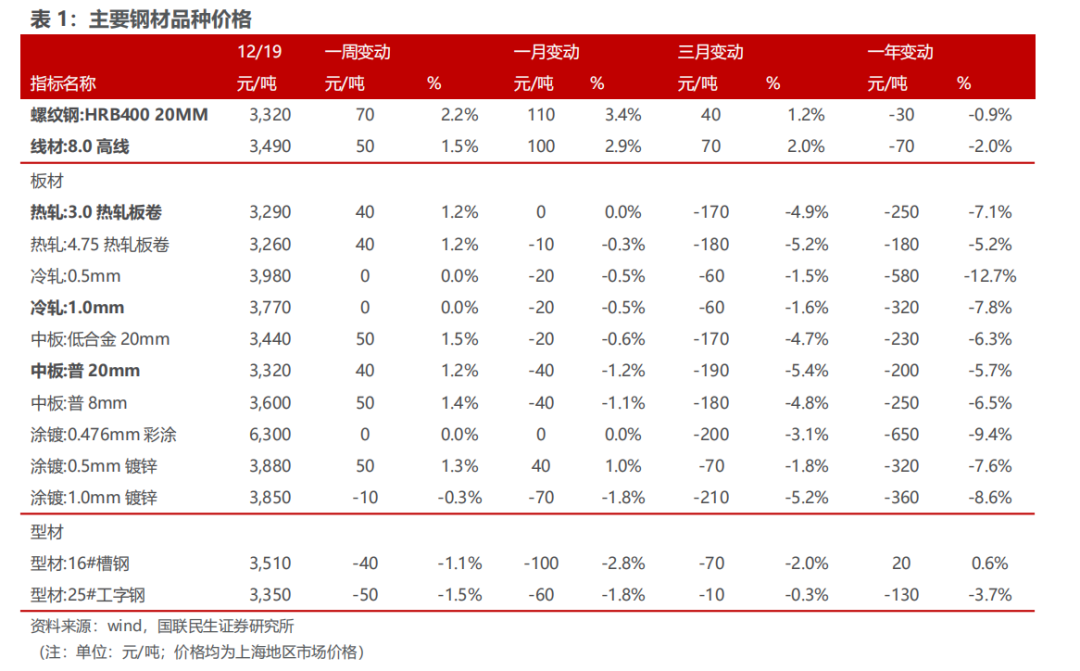 ◾ 价格:本周钢材价格上涨。截至 12 月 19 日,上海 20mm HRB400 材质螺纹价 格为 3320 元/吨,较上周升 70 元/吨。高线 8.0mm 价格为 3490 元/吨,较上周 升 50 元/吨。热轧 3.0mm 价格为 3290 元/吨,较上周升 40 元/吨。冷轧 1.0mm 价格为 3770 元/吨,较上周持平。普中板 20mm 价格为 3320 元/吨,较上周升 40 元/吨。本周原材料中,国产矿市场价格稳中有升,进口矿市场价格稳中有升, 废钢价格下跌。