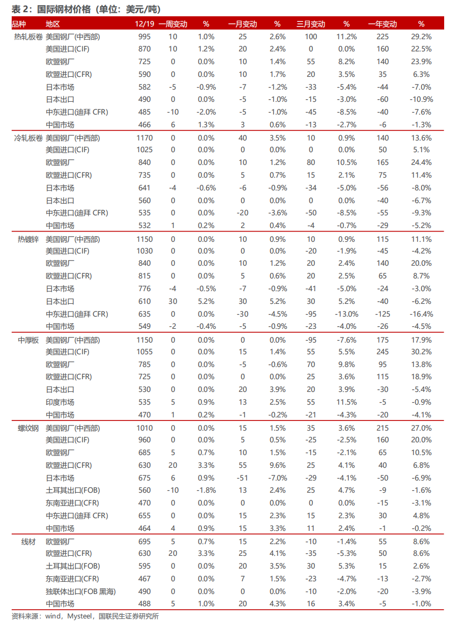 美国钢材市场价格稳中有升。截至12 月 19 日,中西部钢厂的热卷出厂价为 995 美元/吨,较上周升 10 美元/吨;冷卷出厂价为1170 美元/吨,较上周持平。 热镀锌价格为 1150 美元/吨,较上周持平。中厚板价格为 1150 美元/吨,较上周持平。长材方面,螺纹钢出厂价为 1010 美元/吨,较上周持平。