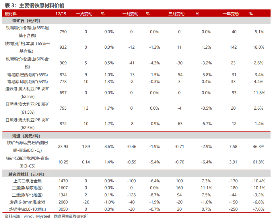 国产矿市场价格稳中有升,进口矿市场价格稳中有升,废钢价格下跌。截至 12 月 19 日,本周鞍山铁精粉价格 750 元/吨,较上周持平;本溪铁精粉价格 932 元/吨,较上周持平;唐山铁精粉价格 909.09 元/吨,较上周升 5 元/吨;国产矿市场价格稳中有升。本周青岛港巴西粉矿 874 元/吨,较上周升 9 元/吨;青岛港印度粉矿778 元/吨,较上周升 10 元/吨;连云港澳大利亚块矿 697 元/吨,较上周持平;日照港澳大利亚粉矿 795 元/吨,较上周升 13 元/吨;日照港澳大利亚块矿 872 元/吨,较上周升 10 元/吨;进口矿市场价格稳中有升。本周海运市场上涨。 本周末废钢报价 2060 元/吨,较上周降 20 元/吨;铸造生铁 3050 元/吨,较上周持平。