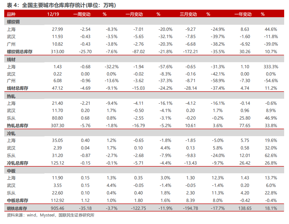 国内钢材市场价格上涨。截至12 月 19 日,上海 20mm HRB400 材质螺纹价格为 3320 元/吨,较上周升 70 元/吨。高线 8.0mm 价格为 3490 元/吨,较上周升 50 元/吨。热轧 3.0mm 价格为 3290 元/吨,较上周升 40 元/吨。冷轧 1.0mm 价格为 3770 元/吨,较上周持平。普中板 20mm 价格为 3320 元/吨,较上周升 40 元/吨