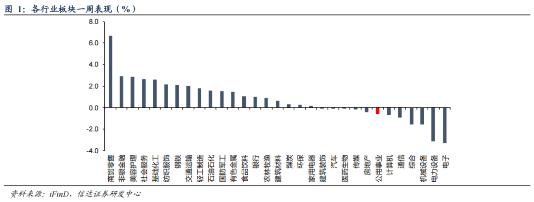 截至12月19日收盘,本周公用事业板块下跌0.6%,表现劣于大盘;沪深300下跌0.3%到4568.18;涨跌幅前三的行业分别是商贸零售(6.7%)、非银金融(2.9%)、美容护理(2.9%),涨跌幅后三的行业分别是电子(-3.3%)、电力设备(-3.1%)、机械设备(-1.6%)。