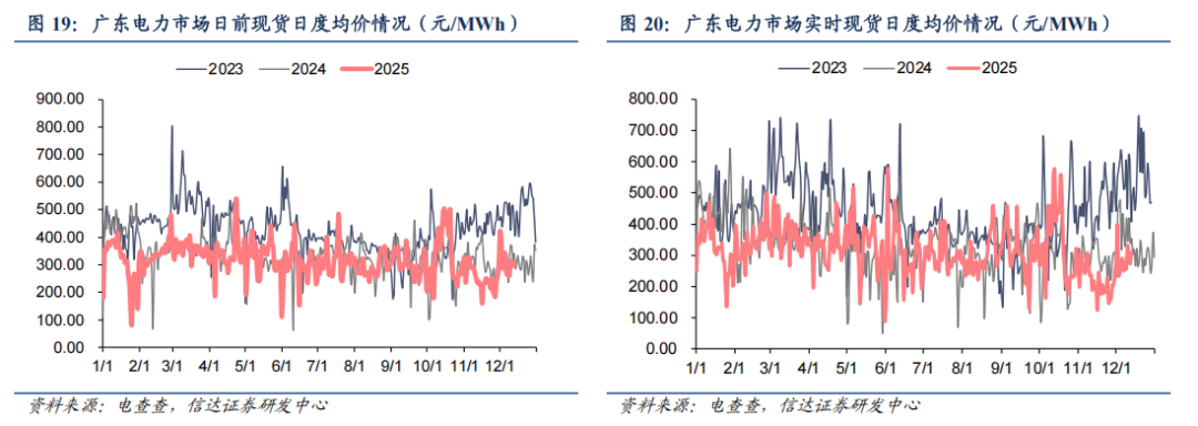 ● 广东实时现货市场:截至12月13日,广东电力实时现货市场的周度均价为283.99元/MWh,周环比上升1.24%,周同比下降22.7%。