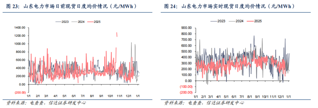 ● 山东实时现货市场:截至12月19日,山东电力实时现货市场的周度均价为248.21元/MWh,周环比下降10.14%,周同比下降10.1%。