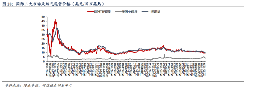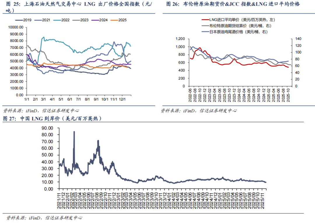 ● 国产LNG价格周环比下跌,进口LNG价格周环比上涨:截至12月18日,上海石油天然气交易中心LNG出厂价格全国指数为4075元/吨(约合2.91元/方),同比下降10.91%,环比下降2.00%;2025年10月,国内LNG进口平均价格为480.51美元/吨(约合2.43元/方),同比下降17.99%,环比下降4.09%。截至12月18日,中国进口LNG到岸价为9.47美元/百万英热(约合2.47元/方),同比下降31.99%,环比上升0.27%。