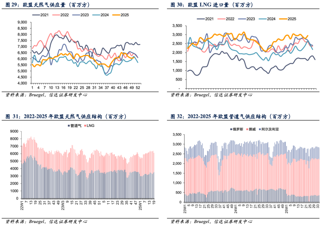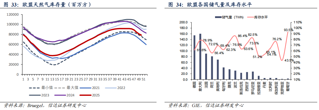 欧盟天然气供需及库存:2025年第50周,欧盟天然气供应量61.1亿方,同比下降1.4%,周环比上升0.9%。其中,LNG供应量为29.5亿方,周环比上升5.6%,占天然气供应量的47.1%;进口管道气31.6亿方,同比下降11.2%,周环比下降3.1%。2025年第50周,欧盟天然气消费量(我们估算)为88.0亿方,周环比下降9.1%,同比下降14.3%;2025年1-50周,欧盟天然气累计消费量(我们估算)为3048.6亿方,同比上升4.4%。