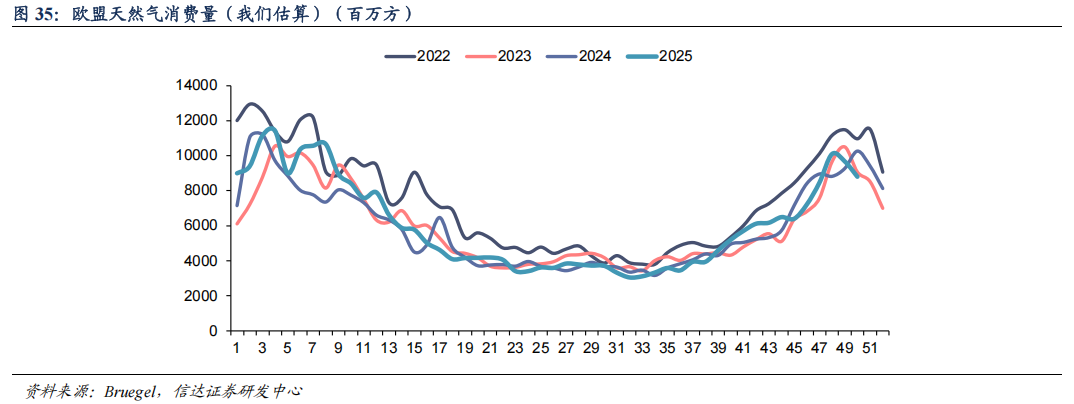 2025年第50周,欧盟天然气消费量(我们估算)为88.0亿方,周环比下降9.1%,同比下降14.3%;2025年1-50周,欧盟天然气累计消费量(我们估算)为3048.6亿方,同比上升4.4%。