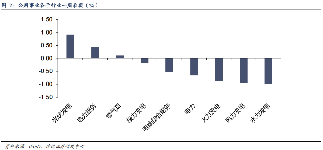 截至12月19日收盘,本周公用事业板块下跌0.6%,表现劣于大盘。其中,电力板块下跌0.66%,燃气板块上涨0.11%。