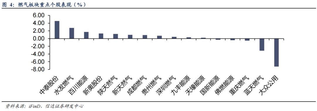 截至12月19日收盘,本周电力板块主要公司涨跌幅前三名分别为:广州发展(0.74%)、南网储能(0.71%)、内蒙华电(0.65%),主要公司涨跌幅后三名分别为:中闽能源(-5.64%)、上海电力(-3.30%)、福能股份(-2.07%);本周燃气板块主要公司涨跌幅前三名分别为:中泰股份(4.53%)、水发燃气(2.76%)、百川能源(1.74%),主要公司涨跌幅后三名分别为:大众公用(-7.23%)、蓝天燃气(-3.14%)、重庆燃气(-0.54%)。