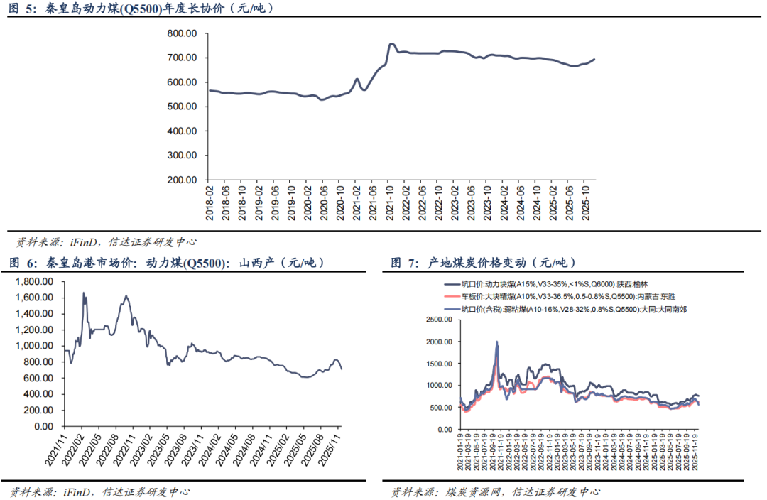 ●长协煤价格:12月,秦皇岛港动力煤(Q5500)年度长协价为694元/吨,月环比上涨10元/吨。