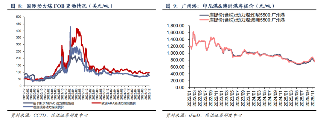 吨;ARA6000大卡动力煤现货价96美元/吨,周环比下跌0.55美元/吨;理查兹港动力煤FOB现货价74.55美元/吨,周环比下跌0.70美元/吨。截至12月19日,纽卡斯尔NEWC指数价格108.6美元/吨,周环比上涨0.4美元/吨。截至12月19日,广州港印尼煤(Q5500)库提价752.07元/吨,周环比下跌17.28元/吨;广州港澳洲煤(Q5500)库提