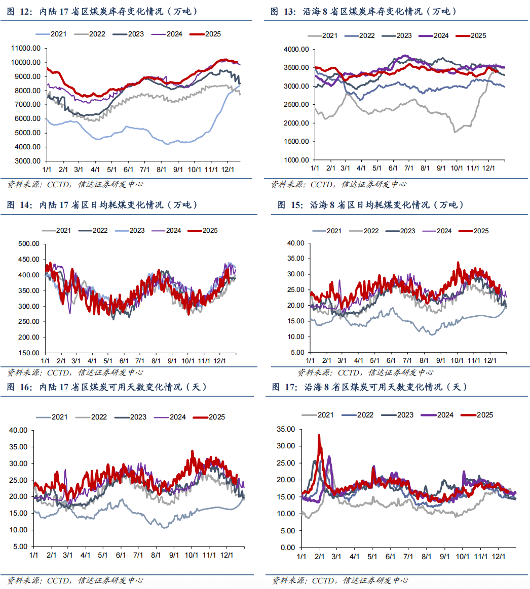 ● 沿海8省电厂库存、日耗及可用天数:截至12月18日,沿海8省煤炭库存3412.4万吨,较上周下降21.8万吨,周环比下降0.63%;沿海8省电厂日耗为204.4万吨,较上周增加4.7万吨/日,周环比上升2.35%;可用天数为16.7天,较上周下降0.5天。