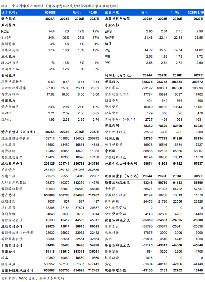 盈利预测和投资评级:基于审慎性原则,暂不考虑本次拟发行股份摊薄因素及收购事项影响,预计公司2025-2027年营业收入分别为2838/2966/3099亿元,归母净利润分别为519/547/575亿元,同比-12%/ 5%/ 5%;EPS分别为2.61/2.75/2.90元,对应当前股价PE为15.53/14.74/14.02倍。公司具备“煤电路港航”产业链一体化优势,煤炭销售长协占比高,业绩稳健,长期重视投资者回报,分红比例高,央企市值考核推动下,估值有望进一步提升,维持“买入”评级。