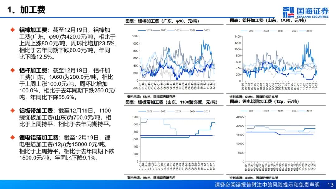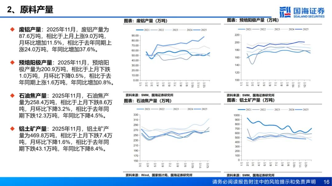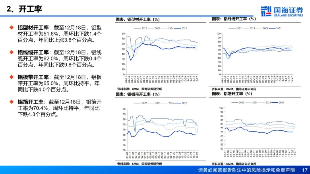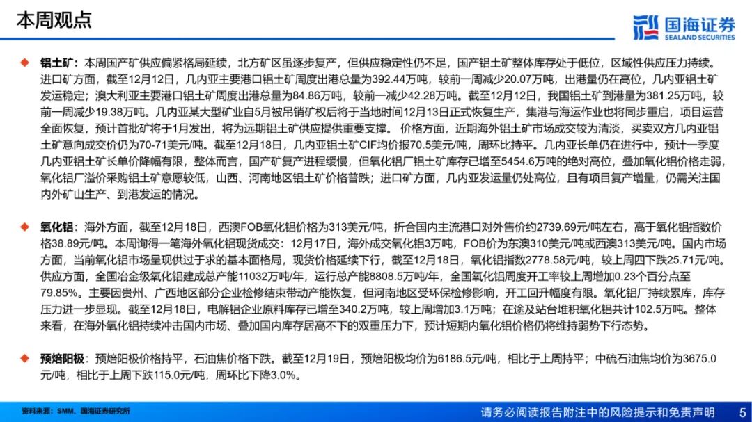 需求:铝棒库存方面,截至12月18日,国内主流消费地铝棒库存11.95万吨,周环比增加0.3万吨。出库方面,12月8日至12月12日期间,铝棒出库量4.32万吨,较前一周减少0.34万吨。展望下周,新疆运力紧张局面稍有缓和,铁路在途运输量环比增加,预计仓库到货量将明显提升,而消费端弱势趋势未改,市场将向 “供过于求” 格局转向,铝棒库存预计止跌回升。本周国内铝下游加工龙头企业周度开工率环比下降0.3的百分点至61.5%,整体延续淡季偏弱运行态势。原生铝合金行业开工率保持在60%,与上周水平持平,市场运行态势稳定,高铝价及紧原料仍然对零单造成压力。铝板带开工率持稳于 65.0%,中原等地的环保限产反复,叠加铝价高位风险及出口预期利空,开工率显著承压。铝线缆周度开工率微降0.4%至62%,呈现弱势回落阶段,终端需求表现乏力,订单支撑力度不足。铝型材开工率环比回落1.4个百分点,降至51.6%,建筑与光伏领域淡季氛围浓厚,订单量持续萎缩,短期内偏弱运行。铝箔龙头企业开工率持稳于 70.4%,双零箔与无菌包需求下滑明显,整体动能不足抑制短期上涨空间。综合而言,淡季气氛浓厚叠加绝对铝价高企,短期内开工率维持低位震荡运行。铝土矿:本周国产矿供应偏紧格局延续,北方矿区虽逐步复产,但供应稳定性仍不足,国产铝土矿整体库存处于低位,区域性供应压力持续。进口矿方面,截至12月12日,几内亚主要港口铝土矿周度出港总量为392.44万吨,较前一周减少20.07万吨,出港量仍在高位,几内亚铝土矿发运稳定;澳大利亚主要港口铝土矿周度出港总量为84.86万吨,较前一减少42.28万吨。截至12月12日,我国铝土矿到港量为381.25万吨,较前一周减少19.38万吨。几内亚某大型矿业自5月被吊销矿权后将于当地时间12月13日正式恢复生产,集港与海运作业也将同步重启,项目运营全面恢复,预计首批矿将于1月发出,将为远期铝土矿供应提供重要支撑。 价格方面,近期海外铝土矿市场成交较为清淡,买卖双方几内亚铝土矿意向成交价仍为70-71美元/吨。截至12月18日,几内亚铝土矿CIF均价报70.5美元/吨,周环比持平。几内亚长单仍在进行中,预计一季度几内亚铝土矿长单价降幅有限,整体而言,国产矿复产进程缓慢,但氧化铝厂铝土矿库存已增至5454.6万吨的绝对高位,叠加氧化铝价格走弱,氧化铝厂溢价采购铝土矿意愿较低,山西、河南地区铝土矿价格普跌;进口矿方面,几内亚发运量仍处高位,且有项目复产增量,仍需关注国内外矿山生产、到港发运的情况。
