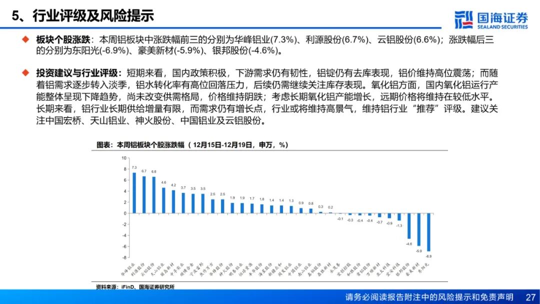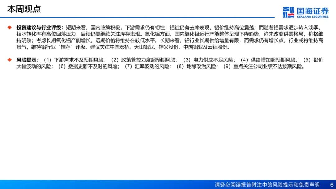 投资建议与行业评级:短期来看,国内政策积极,下游需求仍有韧性,铝锭仍有去库表现,铝价维持高位震荡;而随着铝需求逐步转入淡季,铝水转化率有高位回落压力,后续仍需继续关注库存表现。氧化铝方面,国内氧化铝运行产能整体呈现下降趋势,尚未改变供需格局,价格维持阴跌;考虑长期氧化铝产能增长,远期价格将维持在较低水平。长期来看,铝行业长期供给增量有限,而需求仍有增长点,行业或将维持高景气,维持铝行业“推荐”评级。建议关注中国宏桥、天山铝业、神火股份、中国铝业及云铝股份。