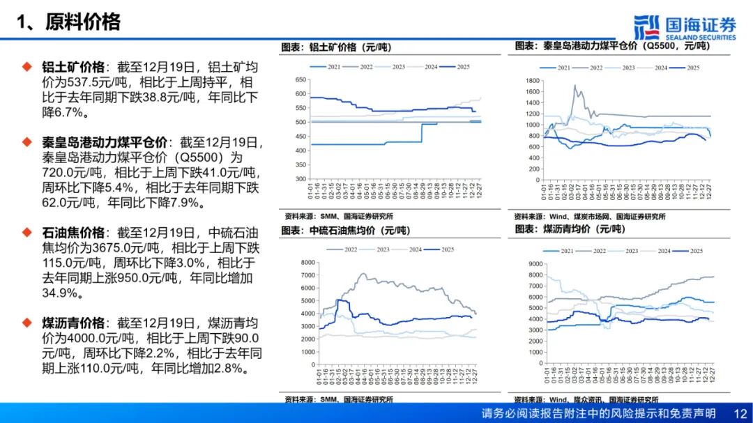 预焙阳极:预焙阳极价格持平,石油焦价格下跌。截至12月19日,预焙阳极均价为6186.5元/吨,相比于上周持平;中硫石油焦均价为3675.0元/吨,相比于上周下跌115.0元/吨,周环比下降3.0%。