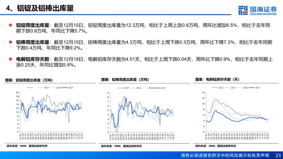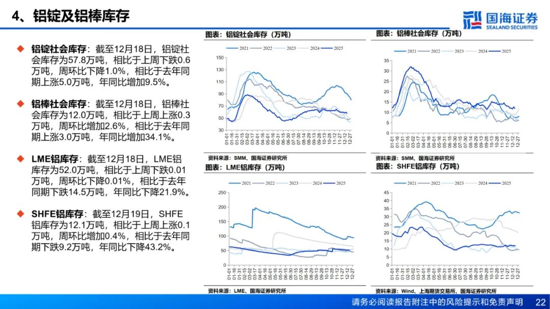 供应:供应端国内及印尼电解铝新增产能稳步释放,运行产量小幅上升带动周度产量增加。受需求转弱影响,周度铝水比例录得76.3%,环比下降0.24个百分点。成本和利润方面,截至12月19日,全国电解铝平均成本为16260元/吨,周环比下降75元/吨,电解铝即时理论利润周环比下降155元/吨至5560元/吨。库存方面,截至12月18日,国内主流消费地电解铝锭库存录得57.8万吨,周环比下降0.6万吨。周内国内铝锭库存呈结构性波动,主流消费地库存延续去库态势,但下游接货意愿偏弱,贸易商出货压力仍存;新疆地区发运状况有所改善,在途库存上升。